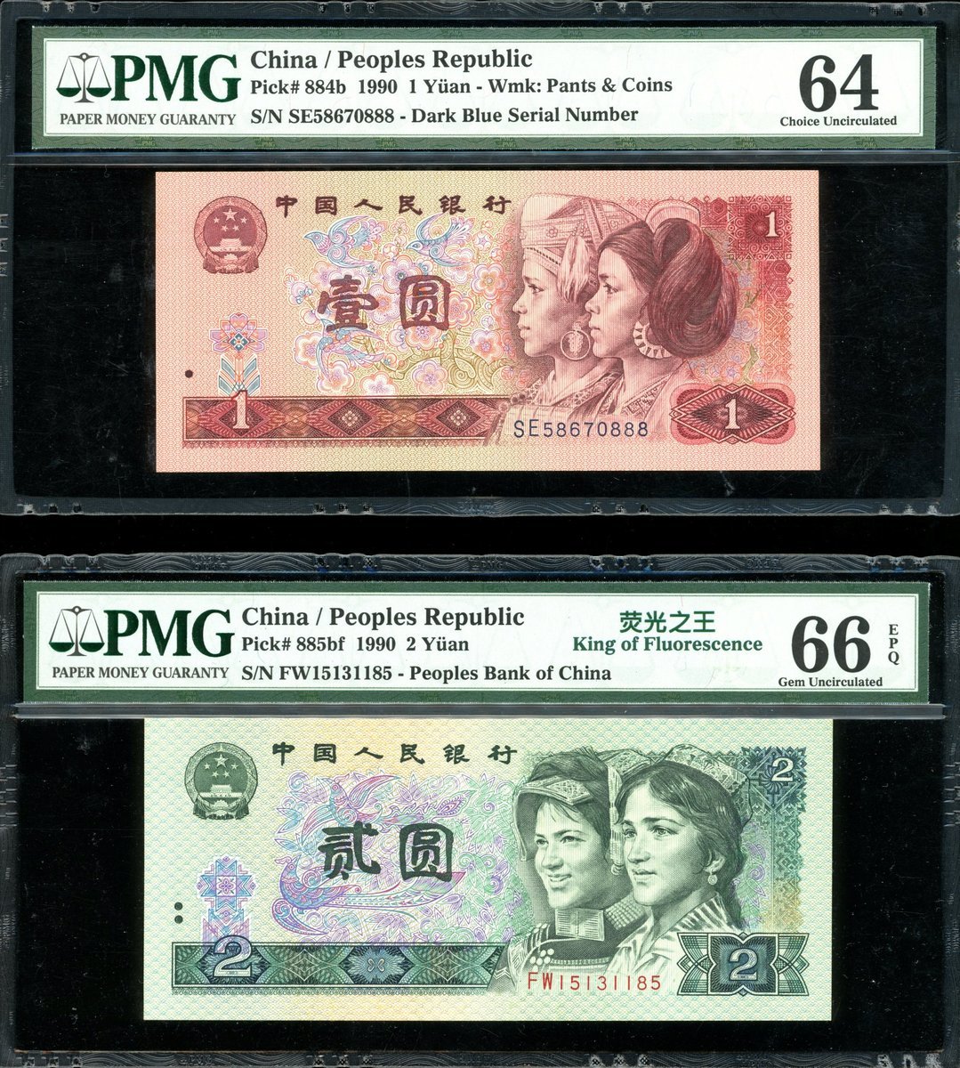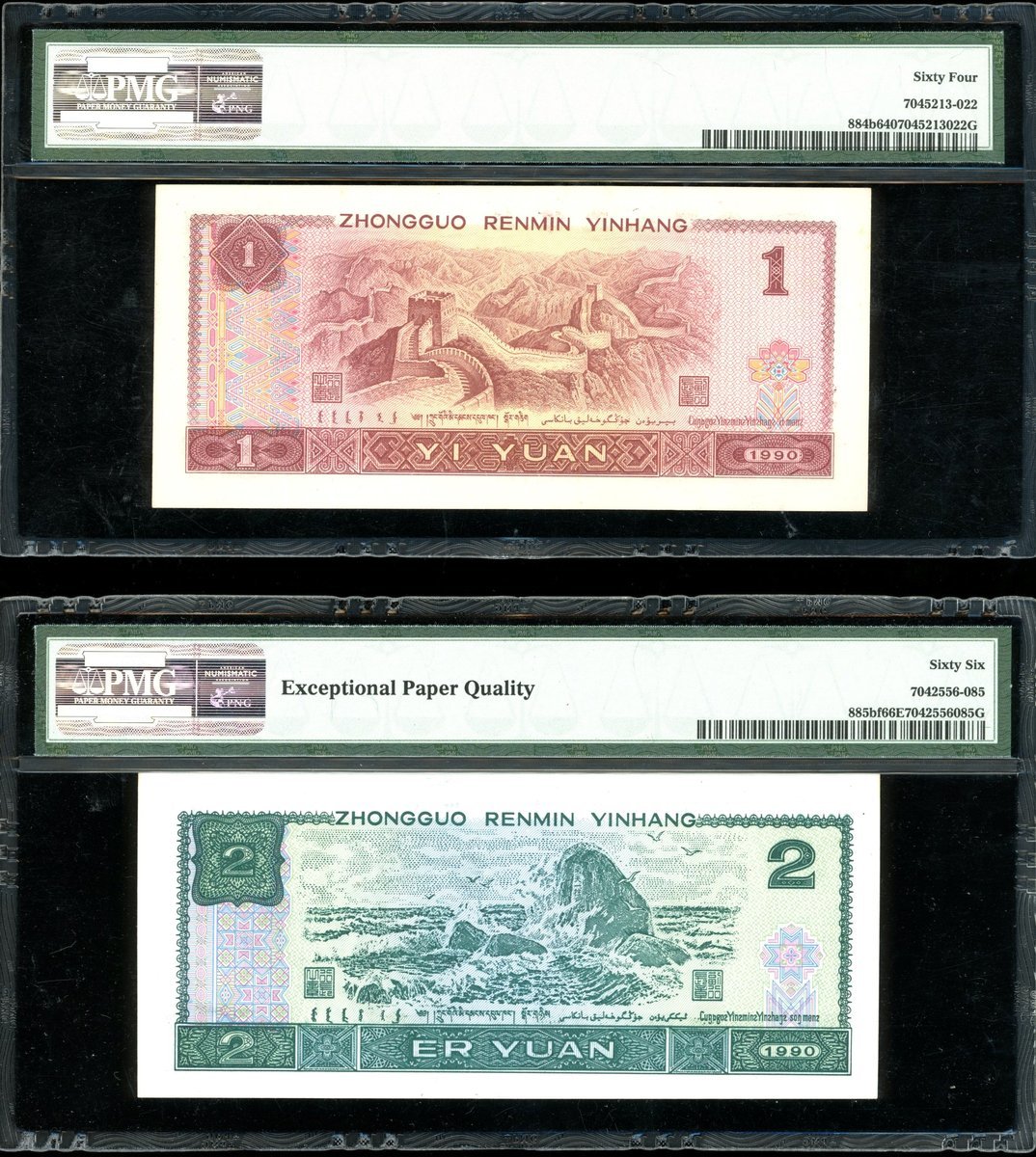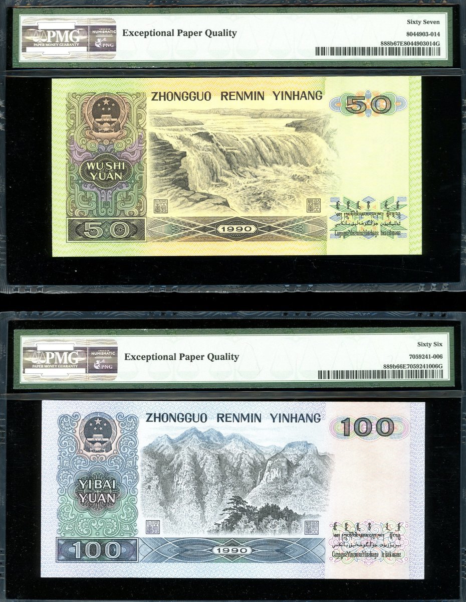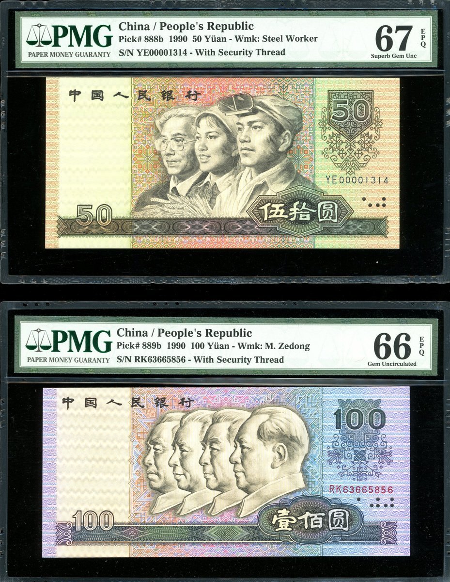 1990年中國人民銀行第四版人民幣一組4枚,包括1元,2元,50元及100元,編號 SE58670888,FW15131185,YE00001314及RK63665856,分別PMG PMG 64, 66EPQ,67EPQ 及 66EPQ