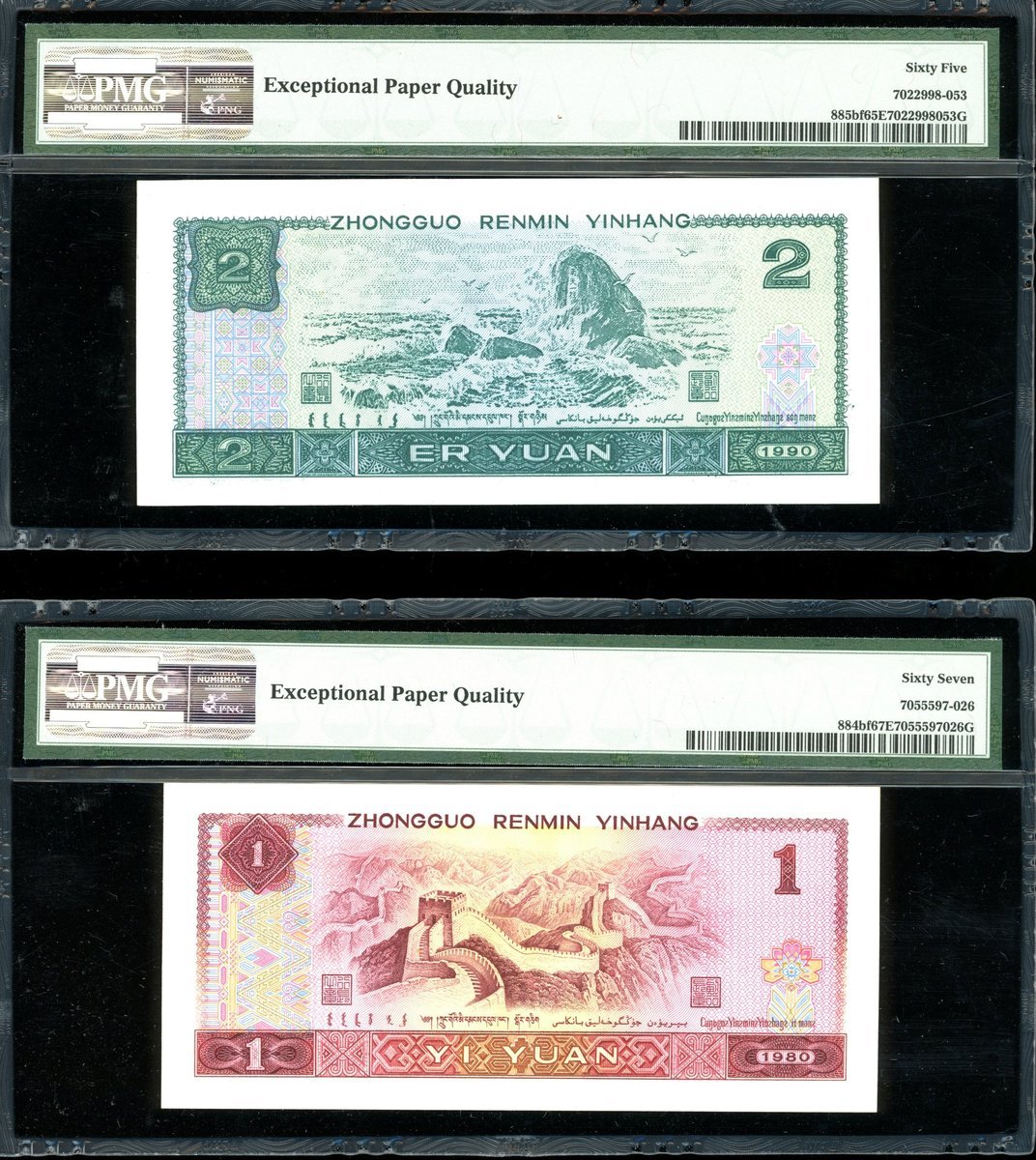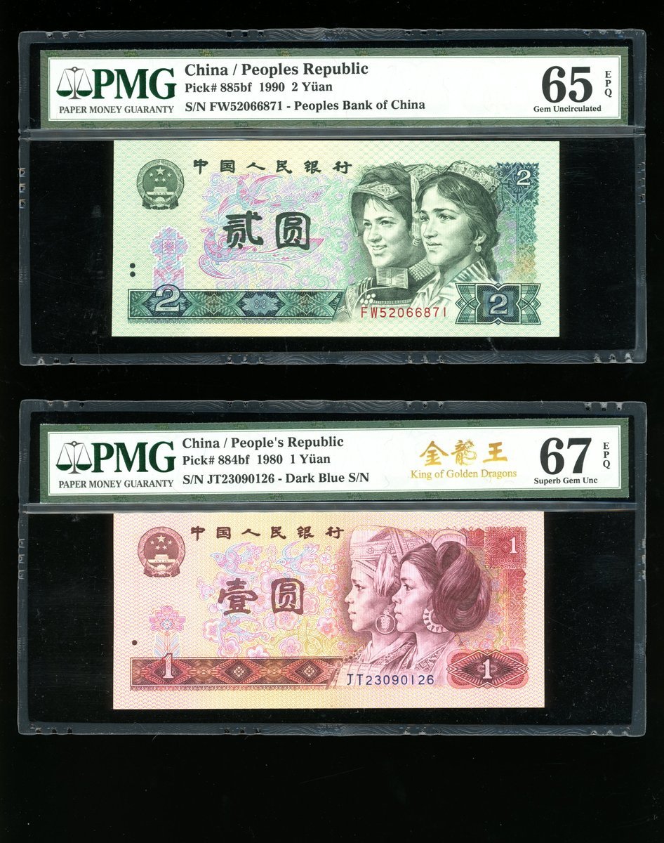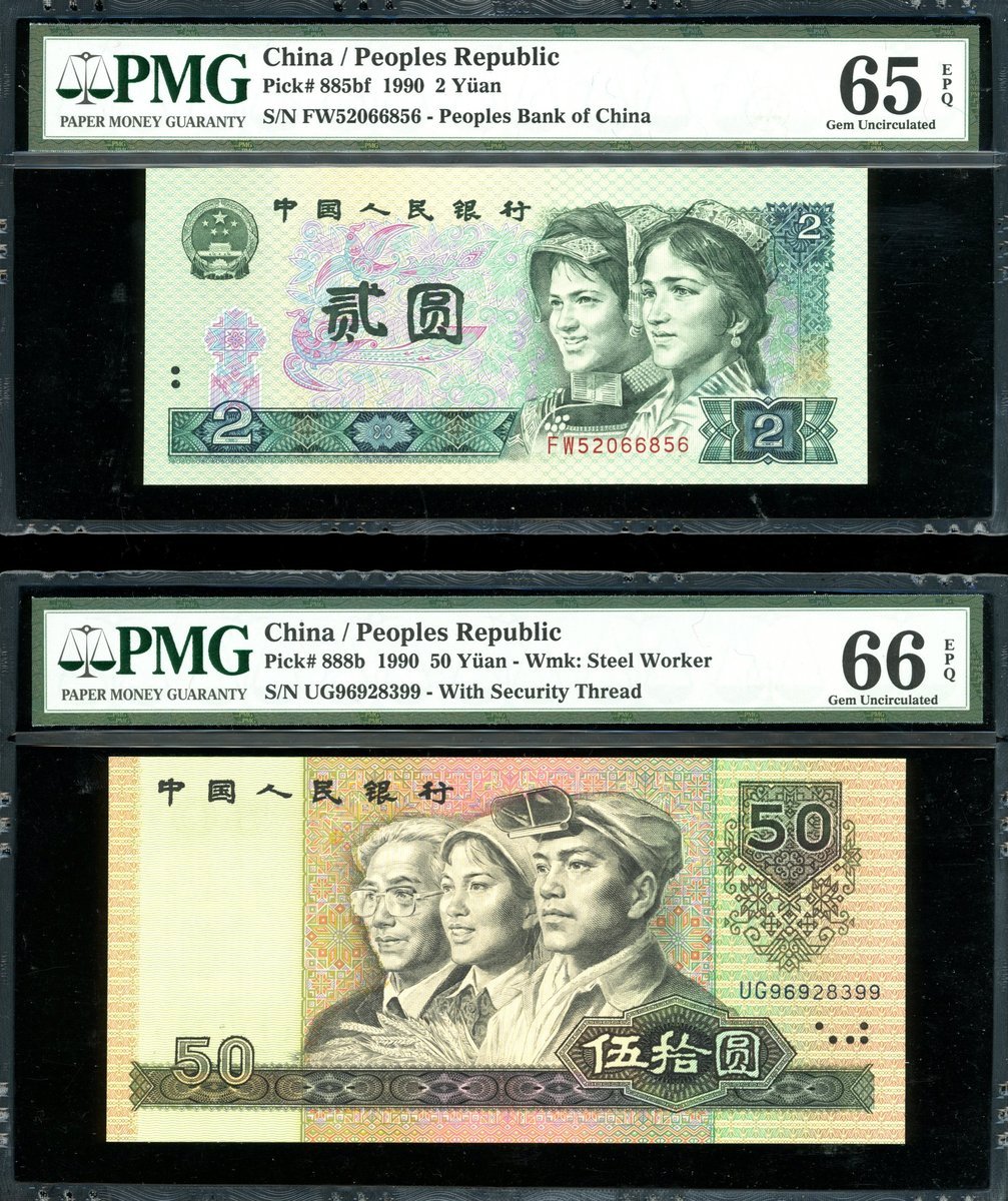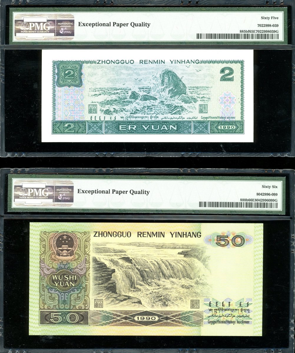 1980-90年中國人民銀行第四版人民幣1元,2元一對及50元,編號JT23090126 (深藍編號), FW52066856/871 及UG96928399,分別PMG 67EPQ, 65EPQ, 65EPQ 及 66EPQ