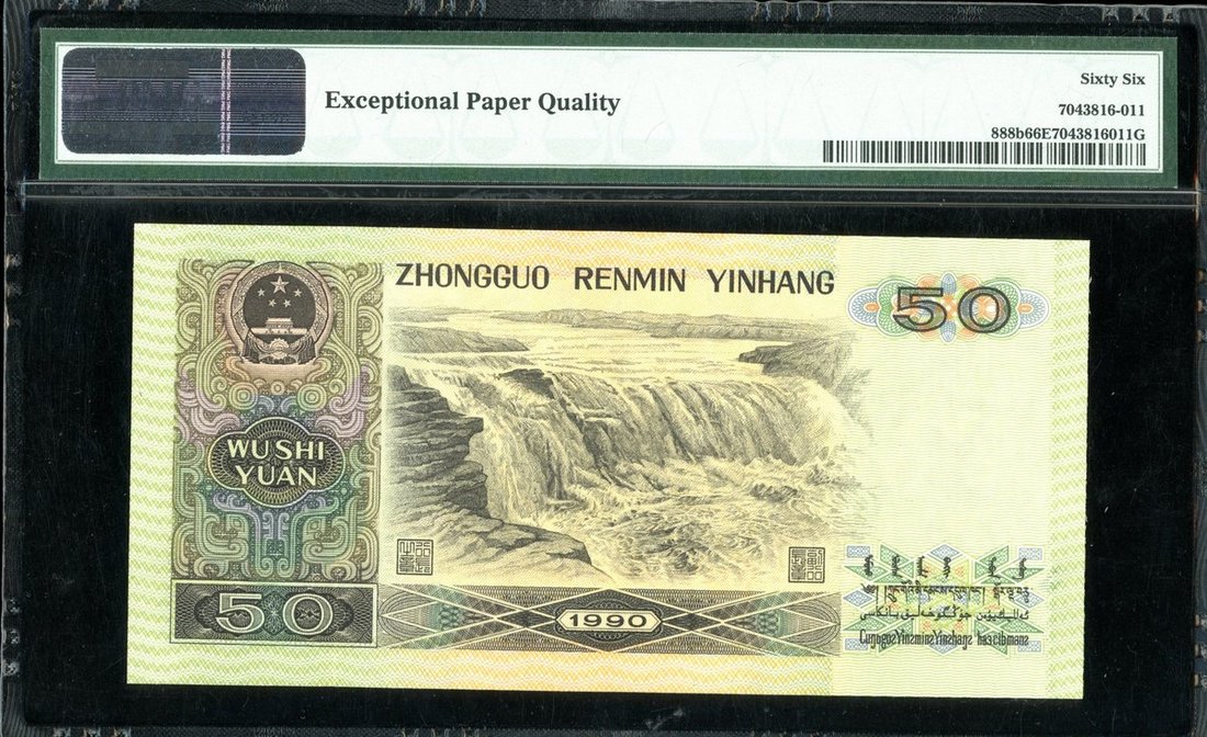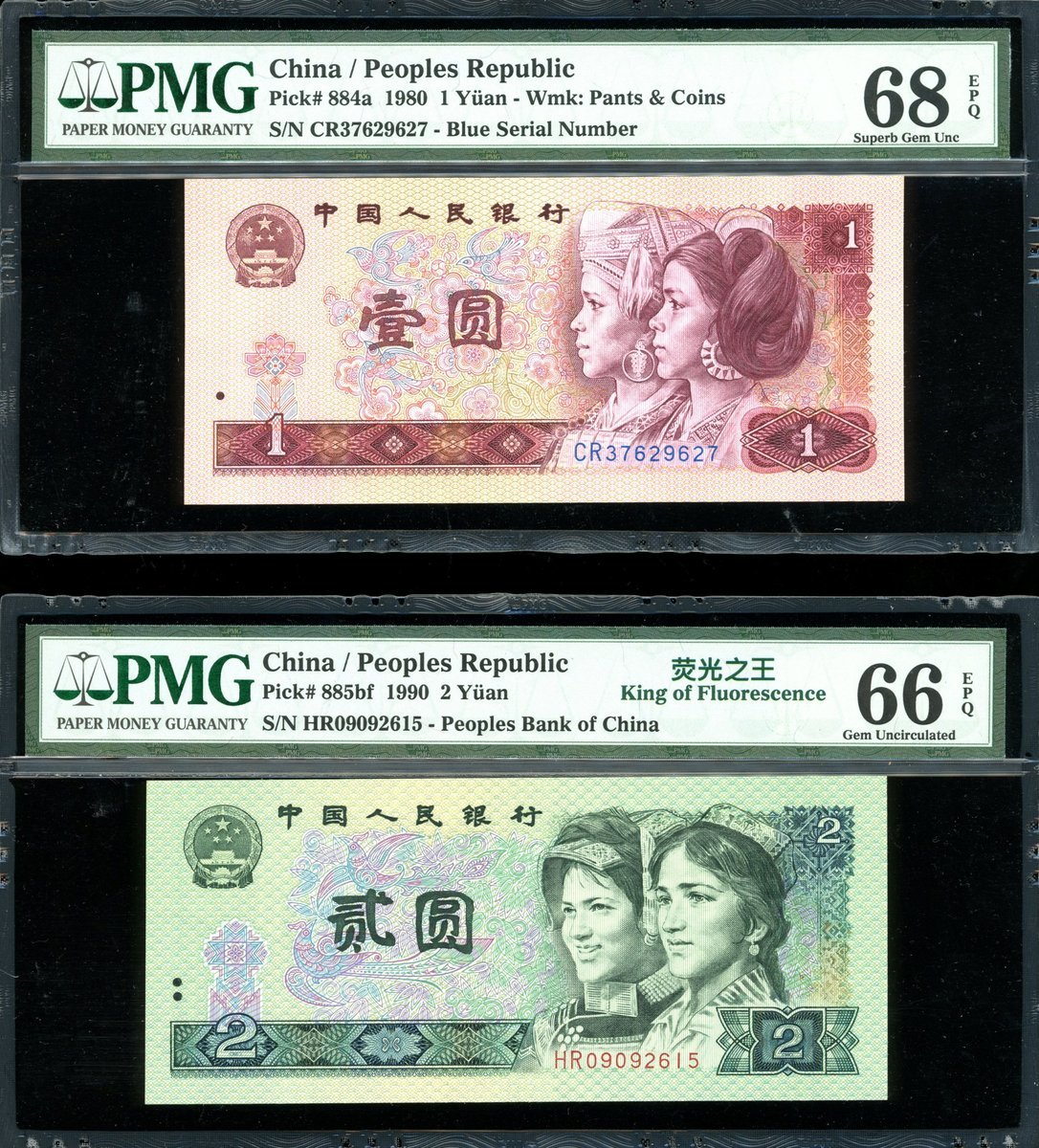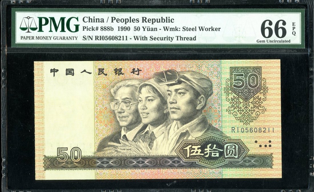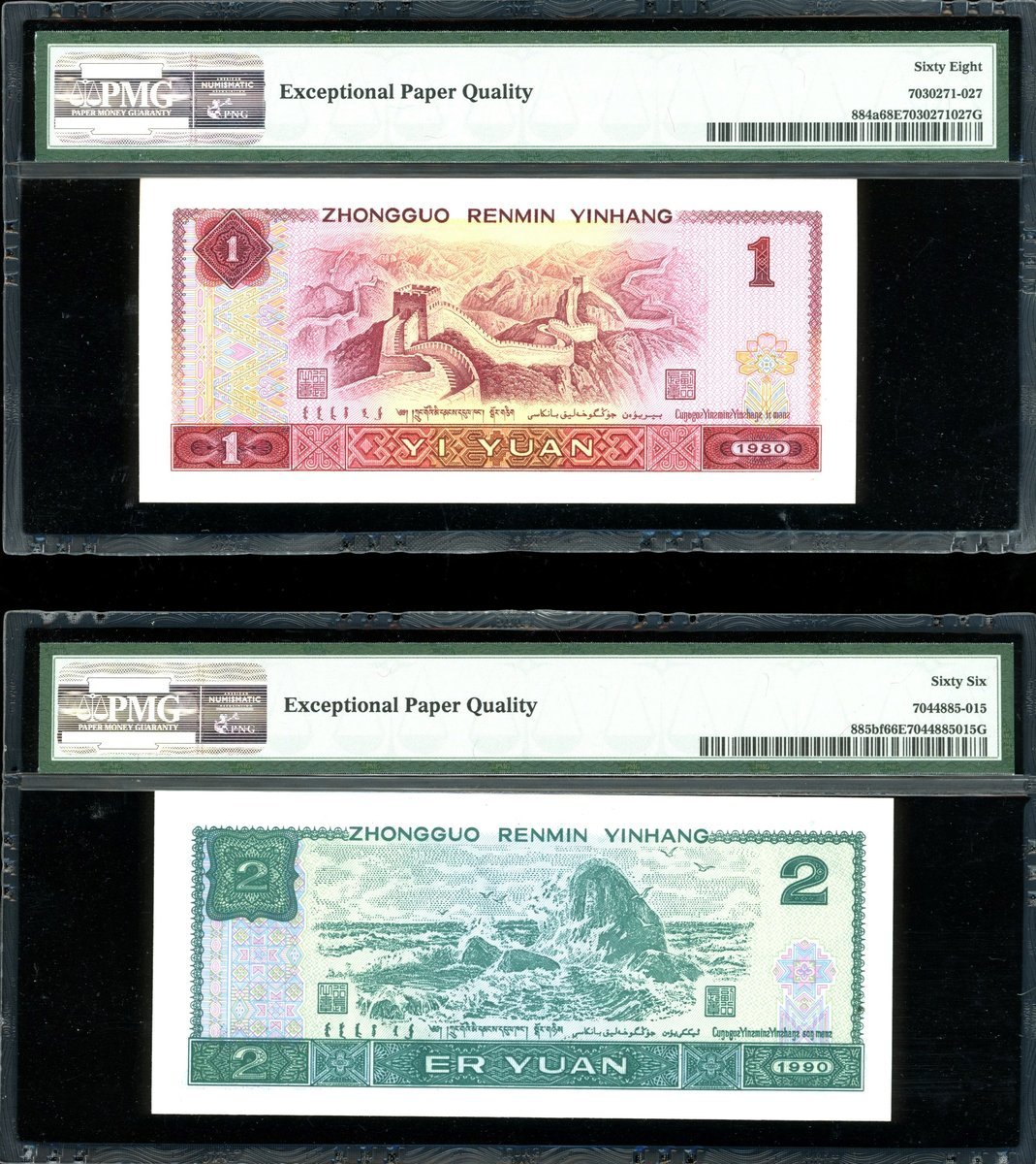 1980-90年中國人民銀行第四版人民幣1元,2元及50元,編號 CR37629627,HR09092615及RI 0560821,分別PMG 68EPQ, 66EPQ 及 66EPQ