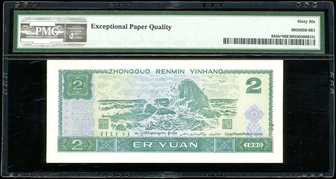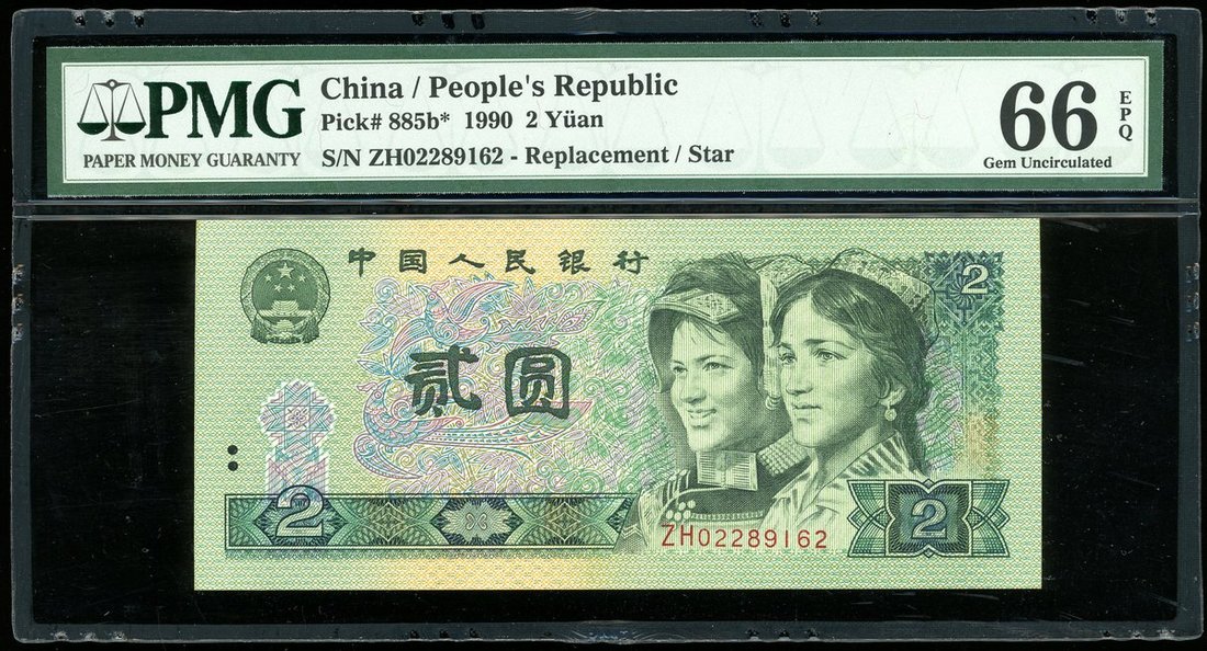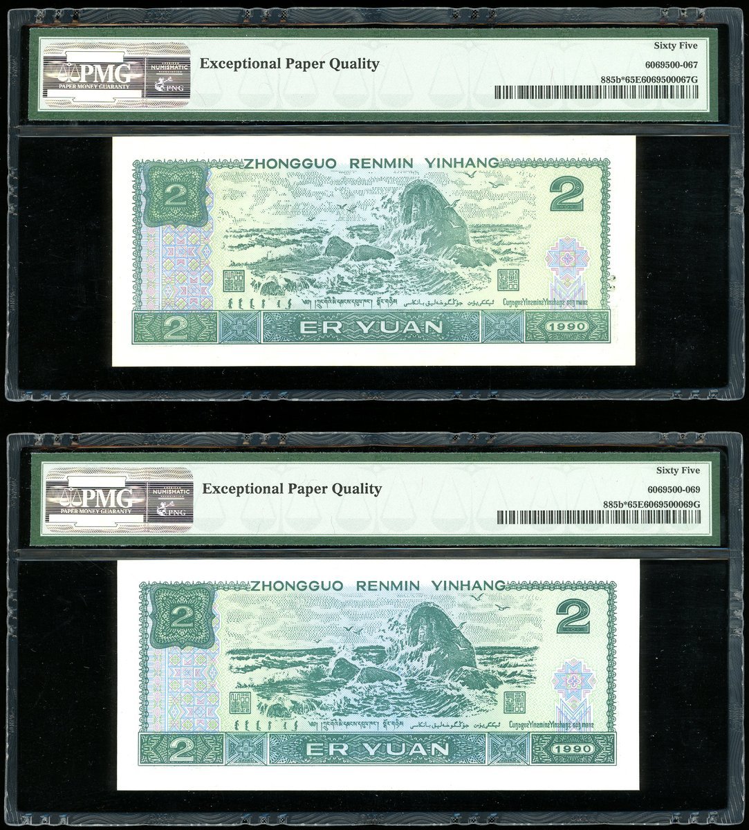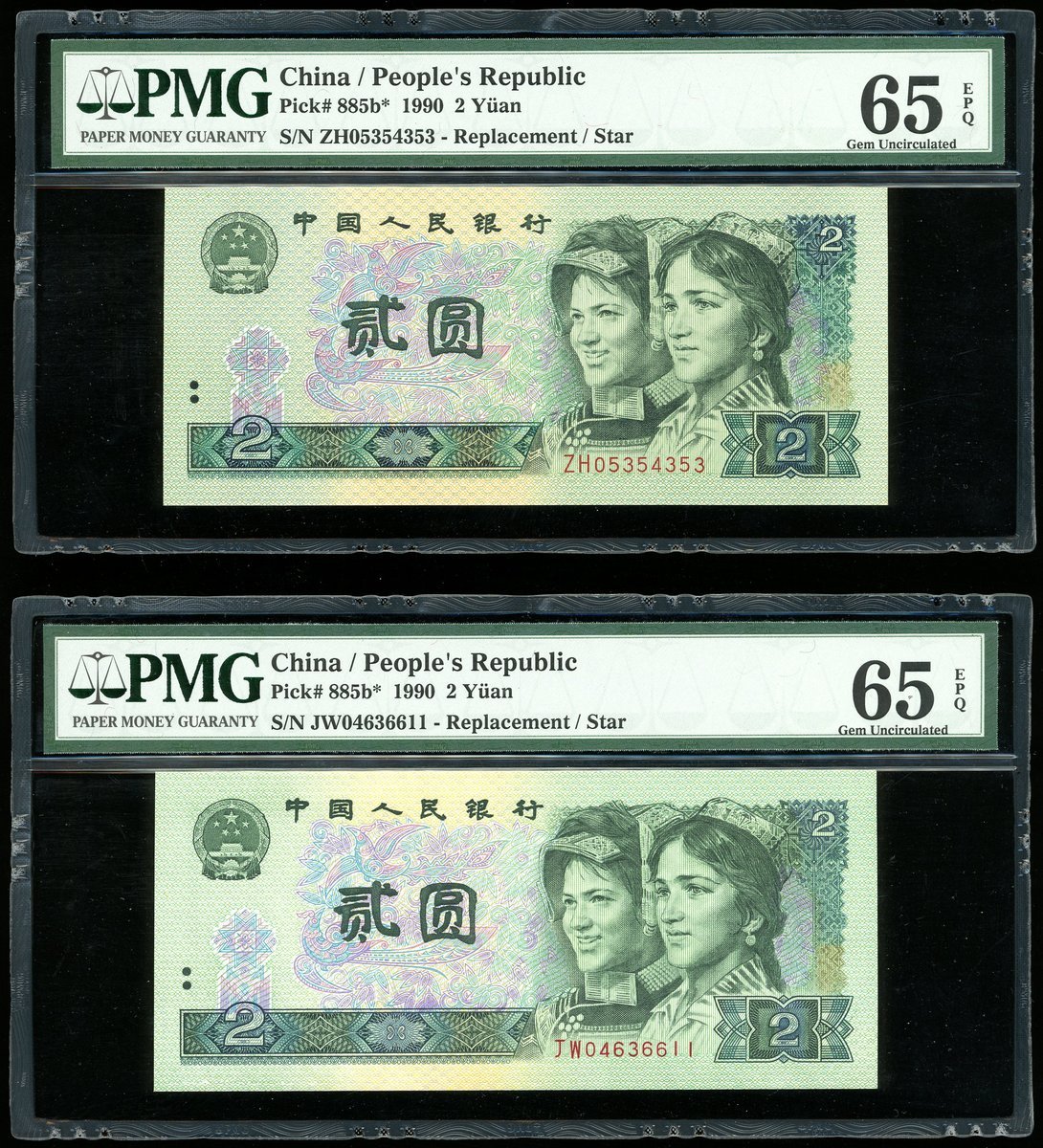 1980年中國人民銀行第四版人民幣2元一組3枚,補版編號ZH05354353, JW04636611 及 ZH02289162,首2枚PMG 65EPQ,第三枚66EPQ