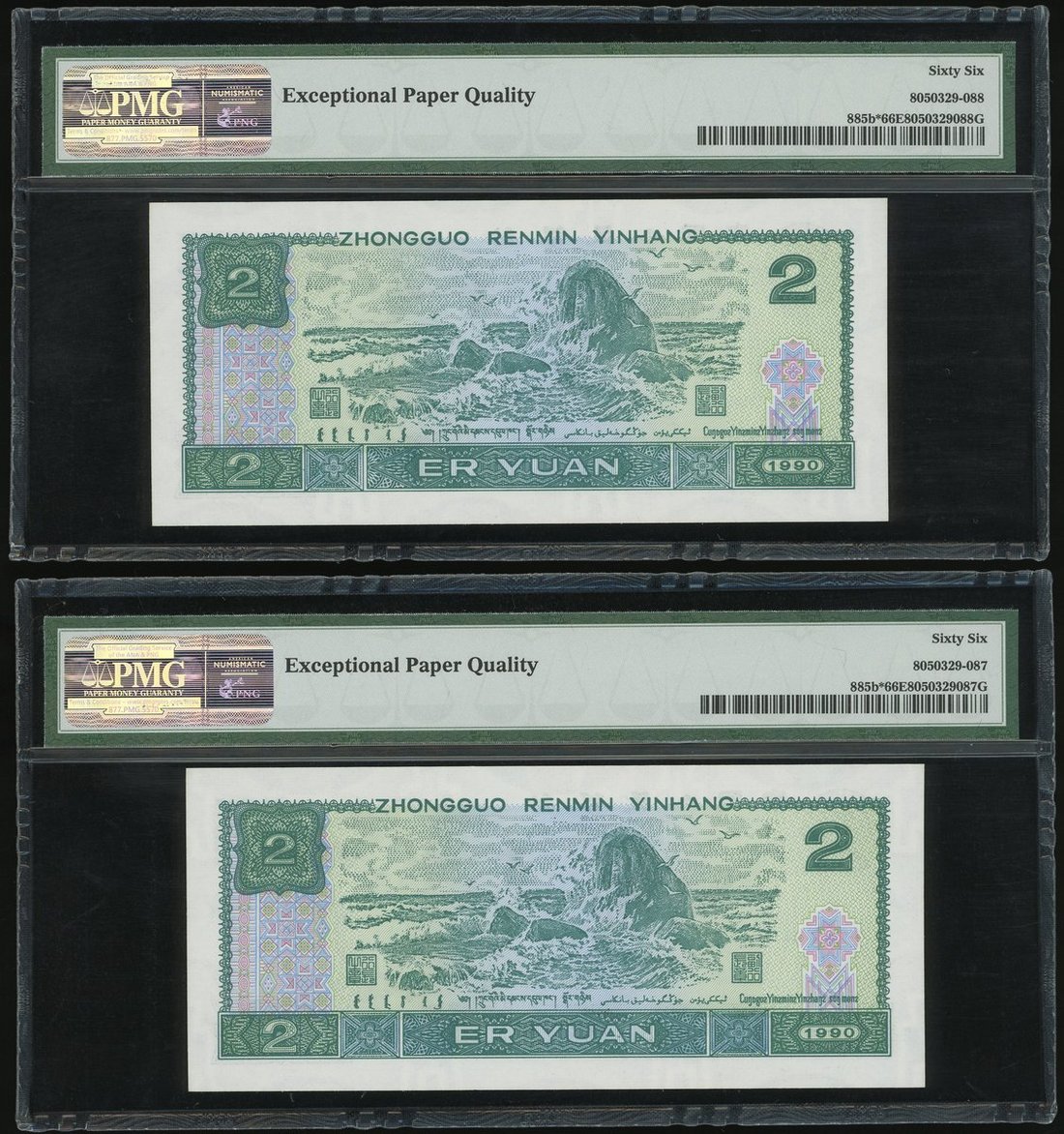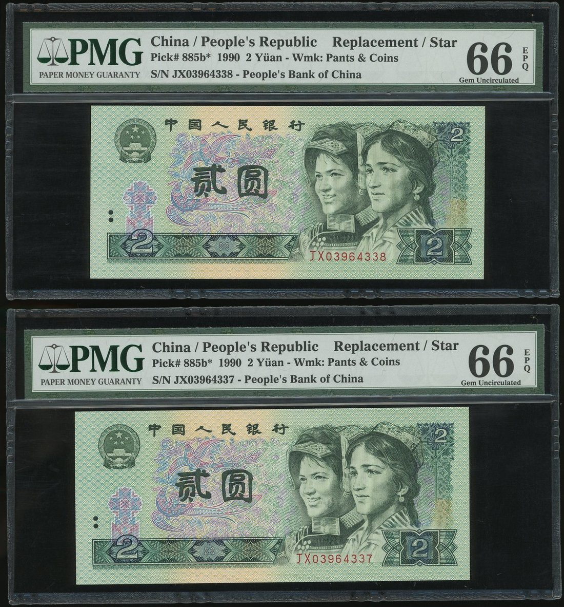 1990年中國人民銀行第四版人民幣2元連號2枚,補版編號JX03964337-338,均PMG 66EPQ