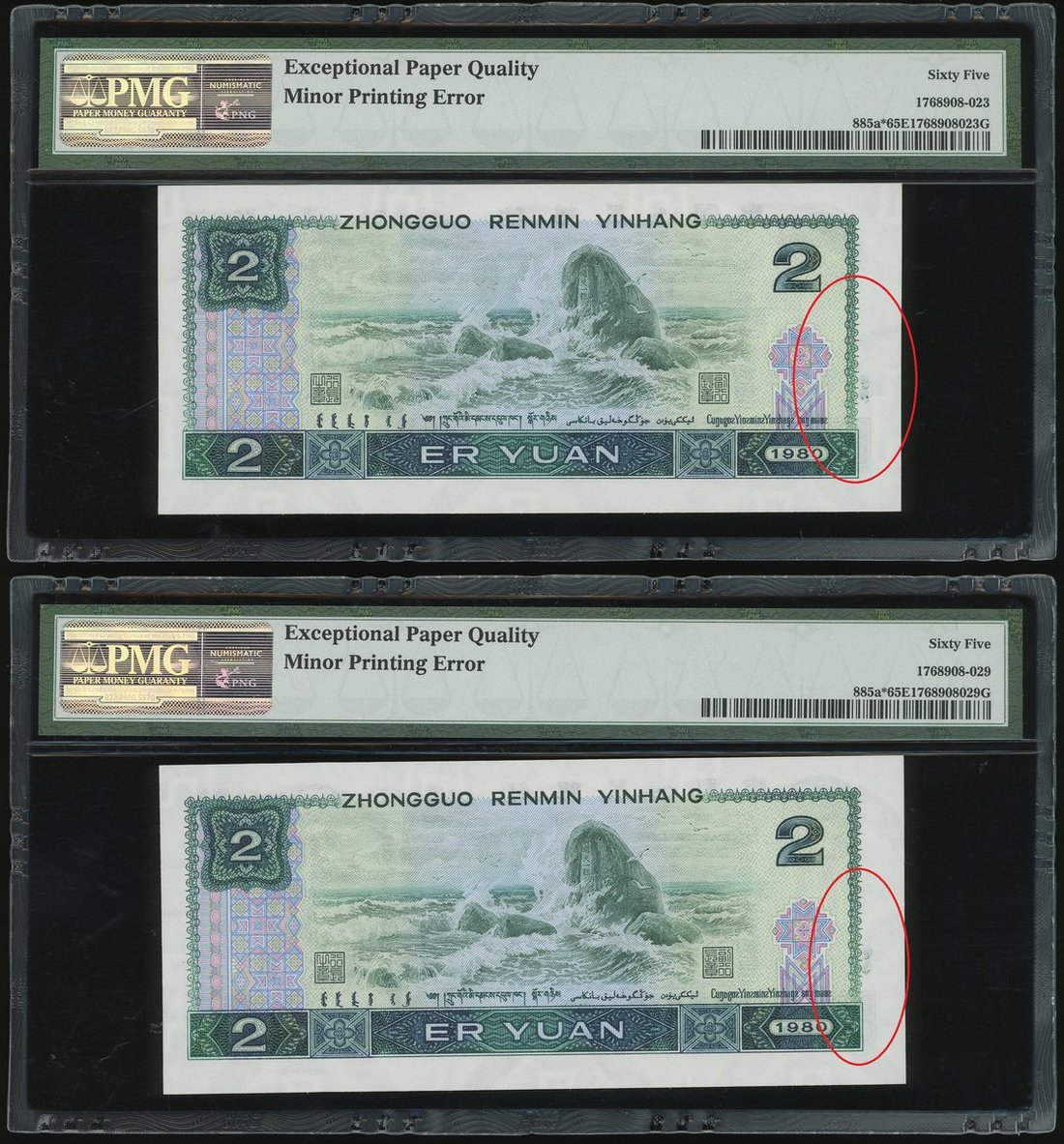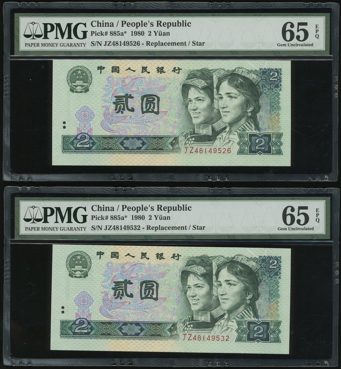 People's Bank of China, 4th series renminbi, 1980, 2x 2 yuan, replacement serial numbers JZ48149526 and 532, minor printing error at reverse right of both notes,