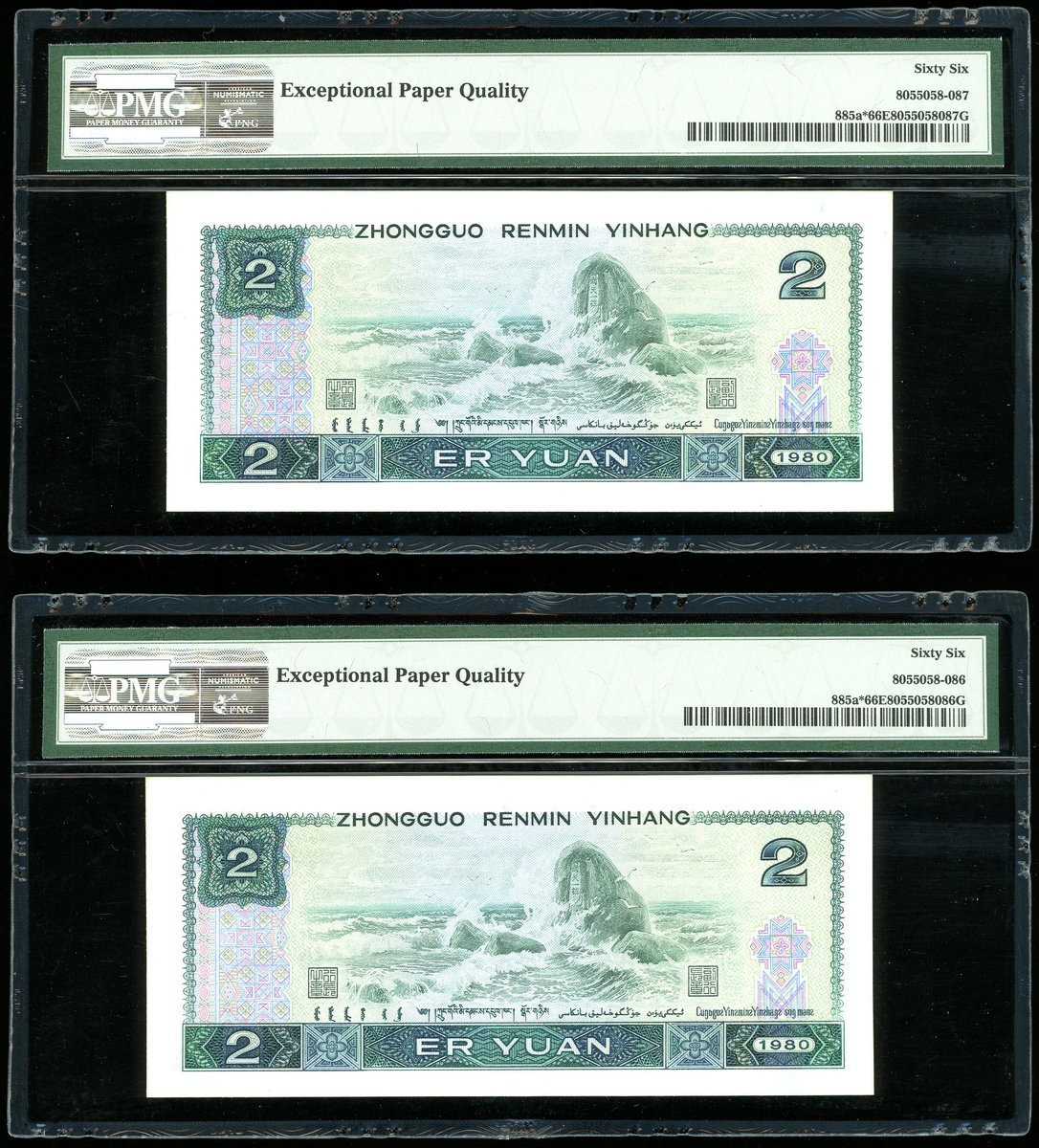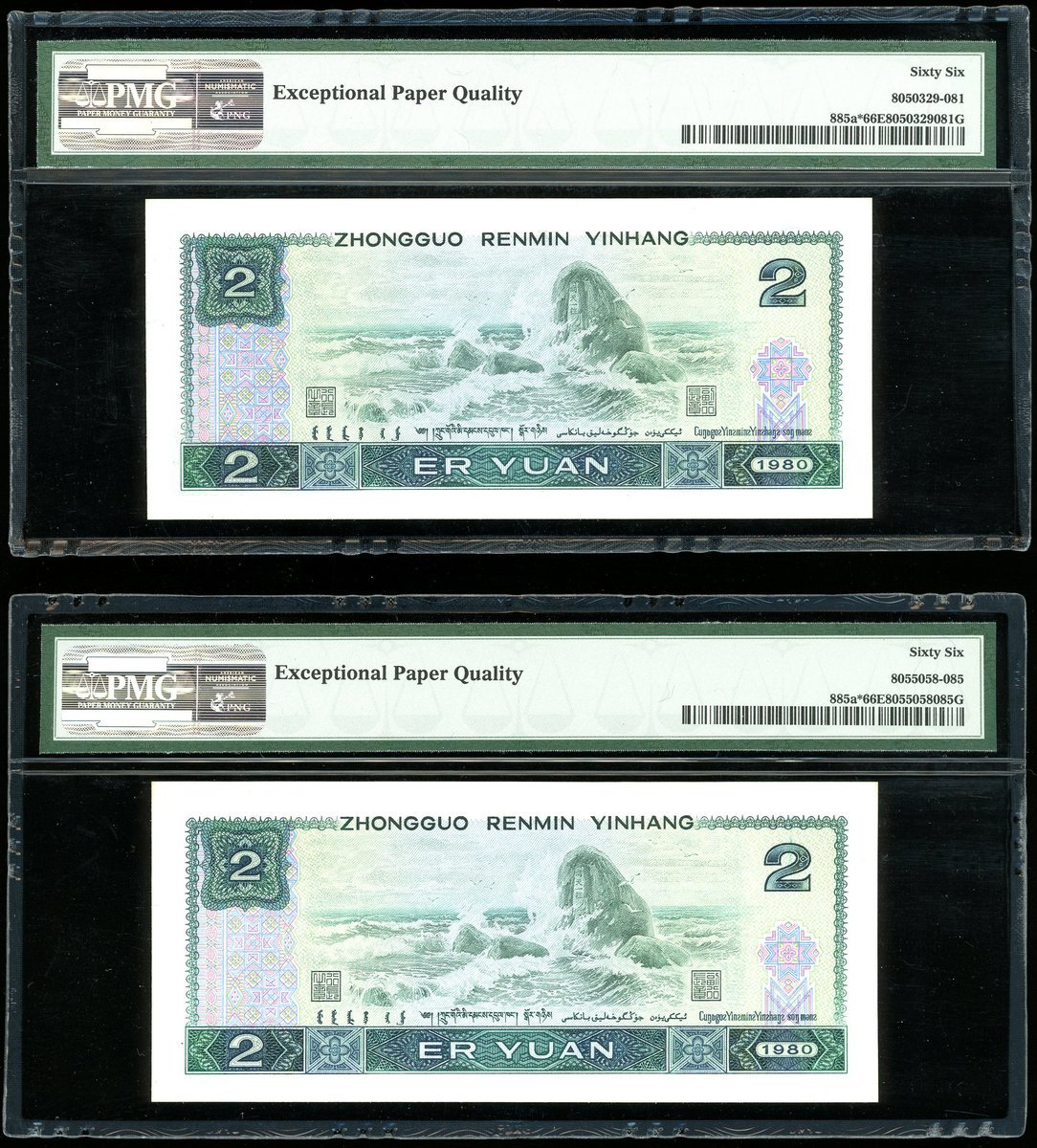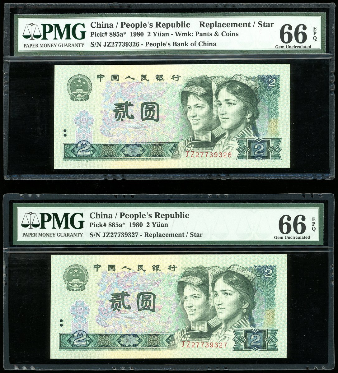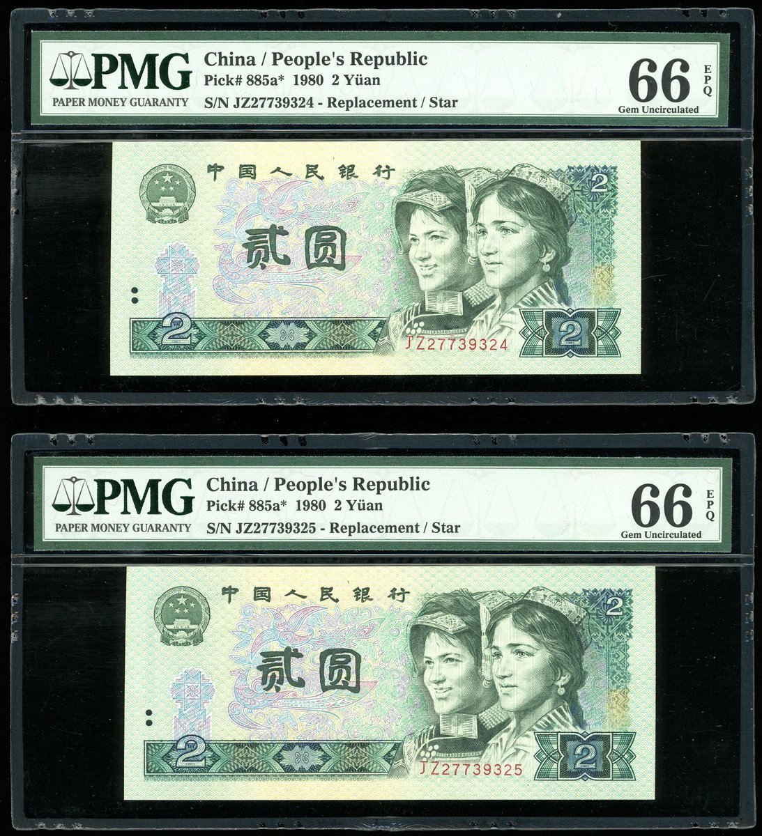 1980年中國人民銀行第四版人民幣2元連號4枚,補版編號JZ27739324-327,均PMG 66EPQ