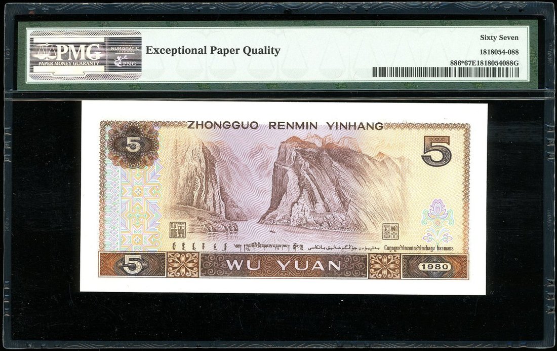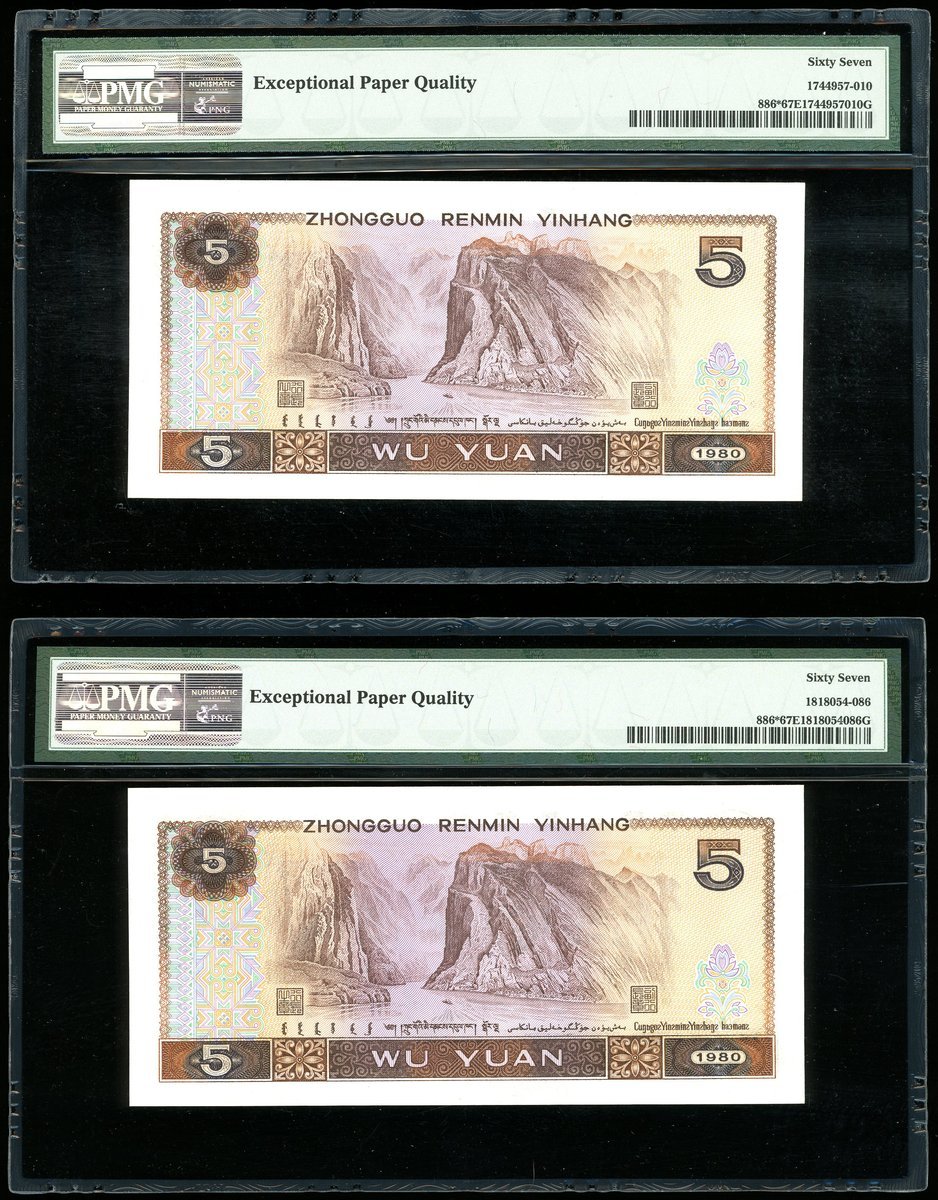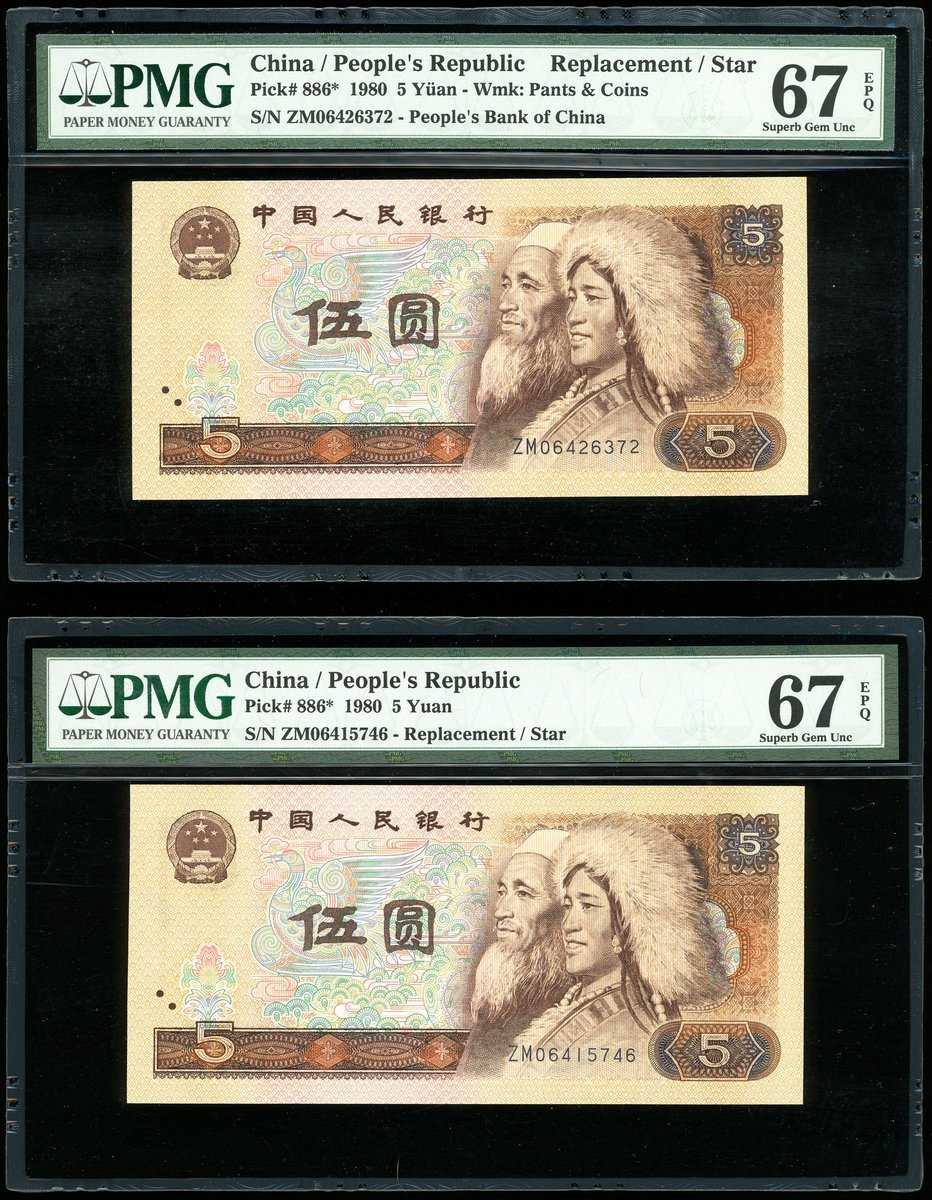 1980年中國人民銀行第四版人民幣5元一組3枚,補版編號ZM06426372, ZM06415746 及 748,均PMG 67 EPQ