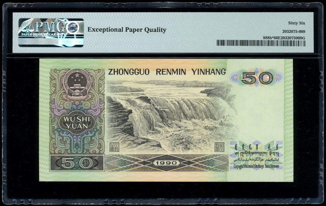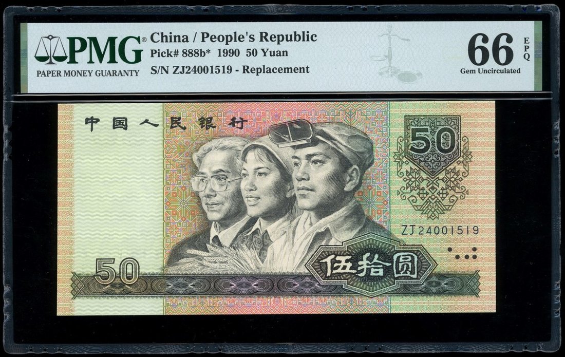 1990年中國人民銀行第四版人民幣50元,補號ZJ24001519,PMG 66EPQ