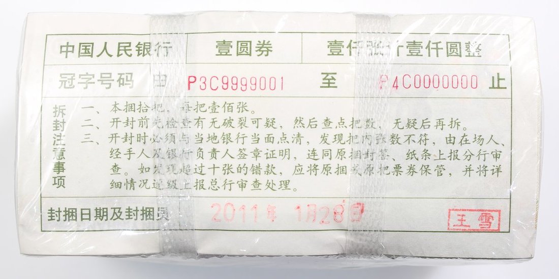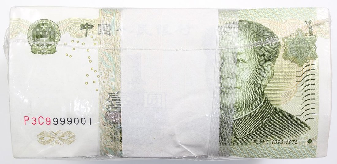 People's Bank of China, 1000x 1 yuan, 1999, serial numbers P3C9999001 to P4C0000000 including 9999999, uncirculated, sealed as issued (1000)