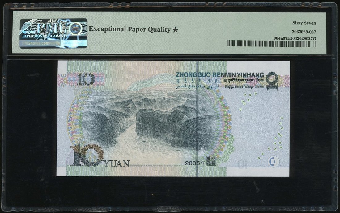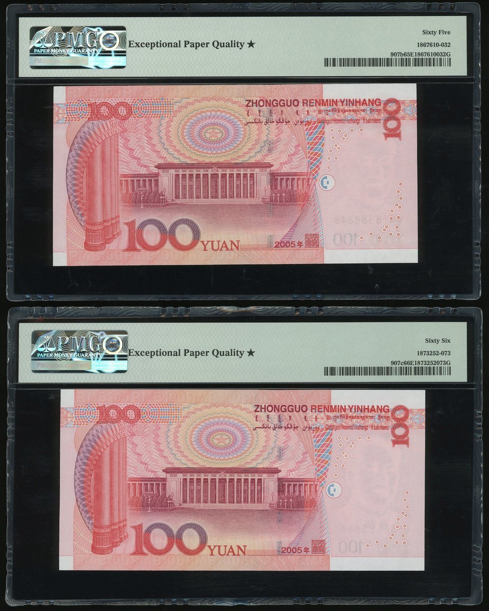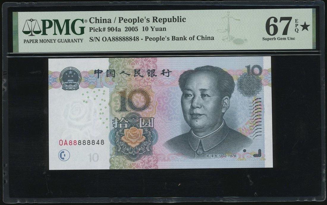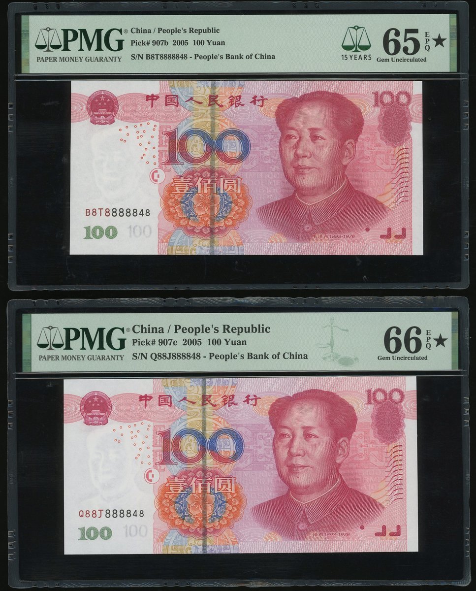 2005年中國人民銀行第五版人民幣一組3枚,10元及100元2枚,不同字軌相同編號 OA88888848, B8T8888848 及 Q88T888848,分別PMG 67EPQ*, 65EPQ* 及 66EPQ*
