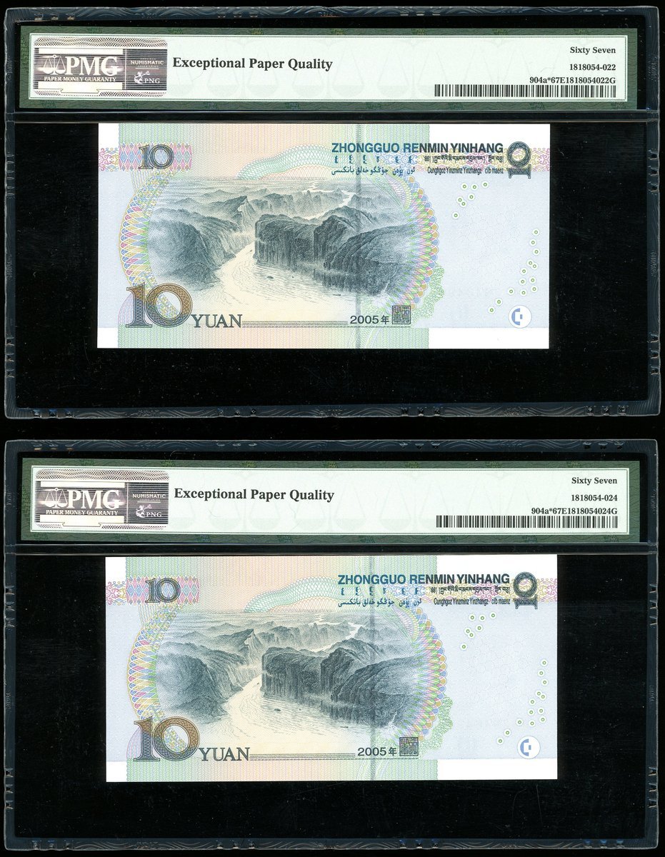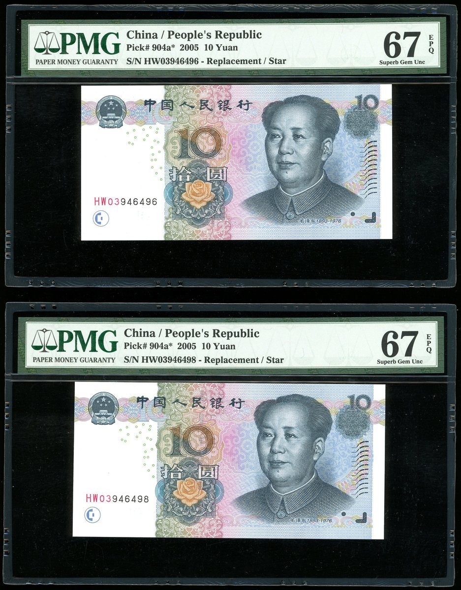 2005年中國人民銀行第五版人民幣10元2枚,補號 HW03946496 及 498,均PMG 67EPQ