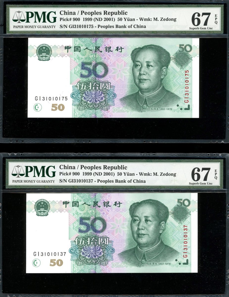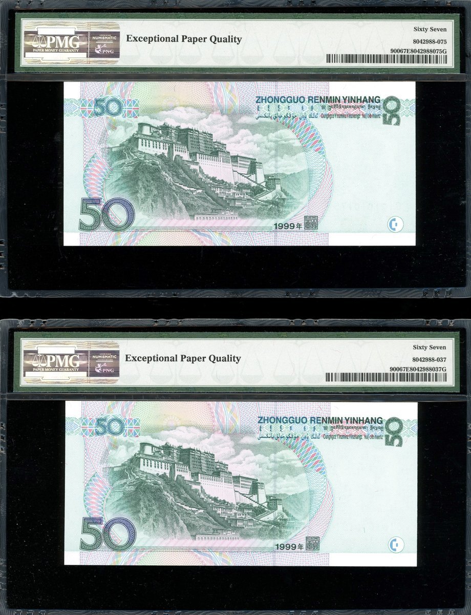 1999年中國人民銀行第五版人民幣50元一對,編號GI 31010137 及 175,均PMG 67EPQ