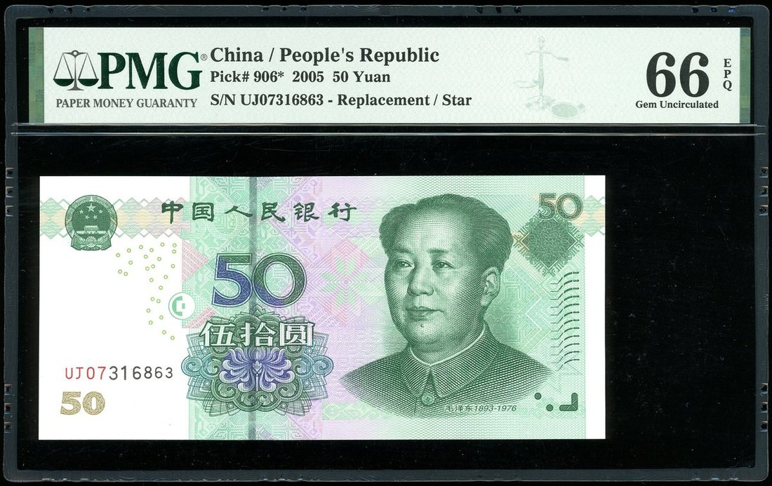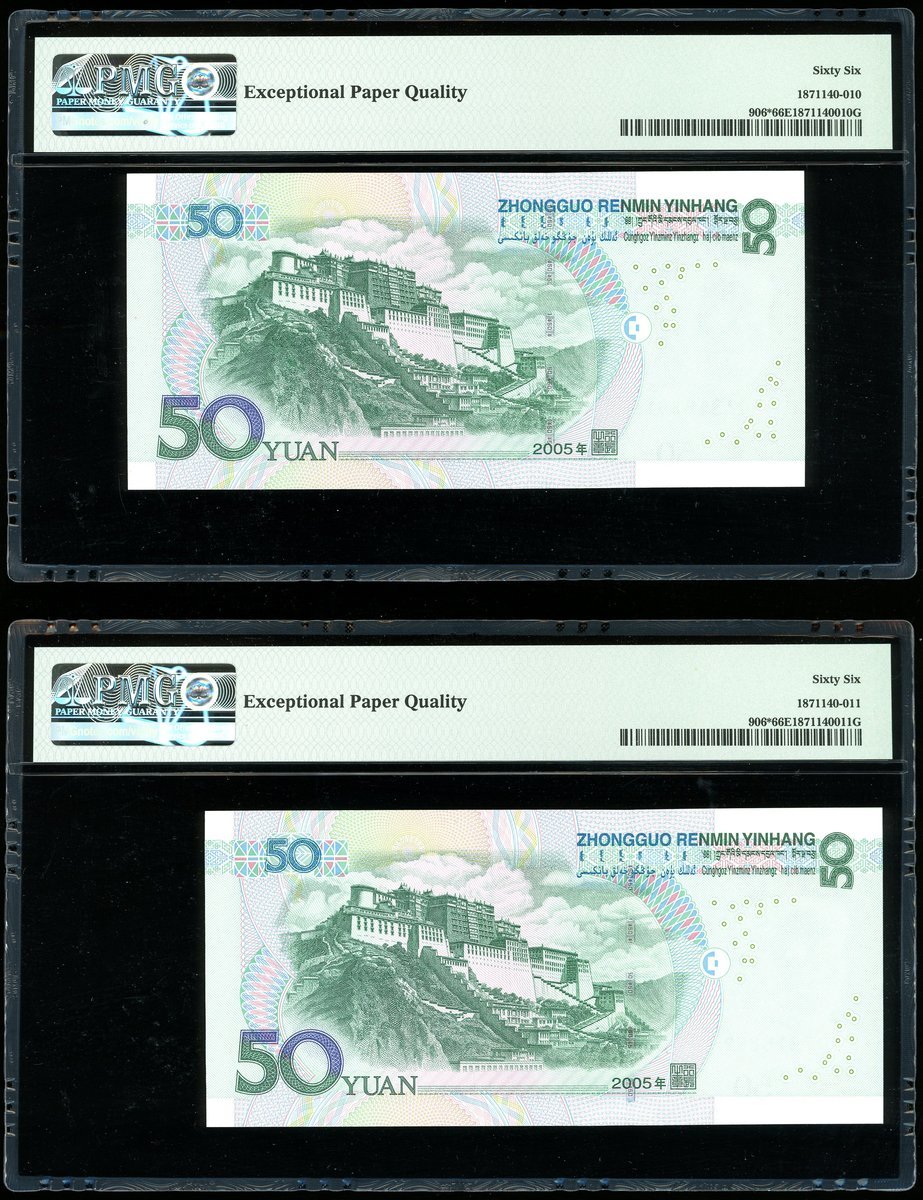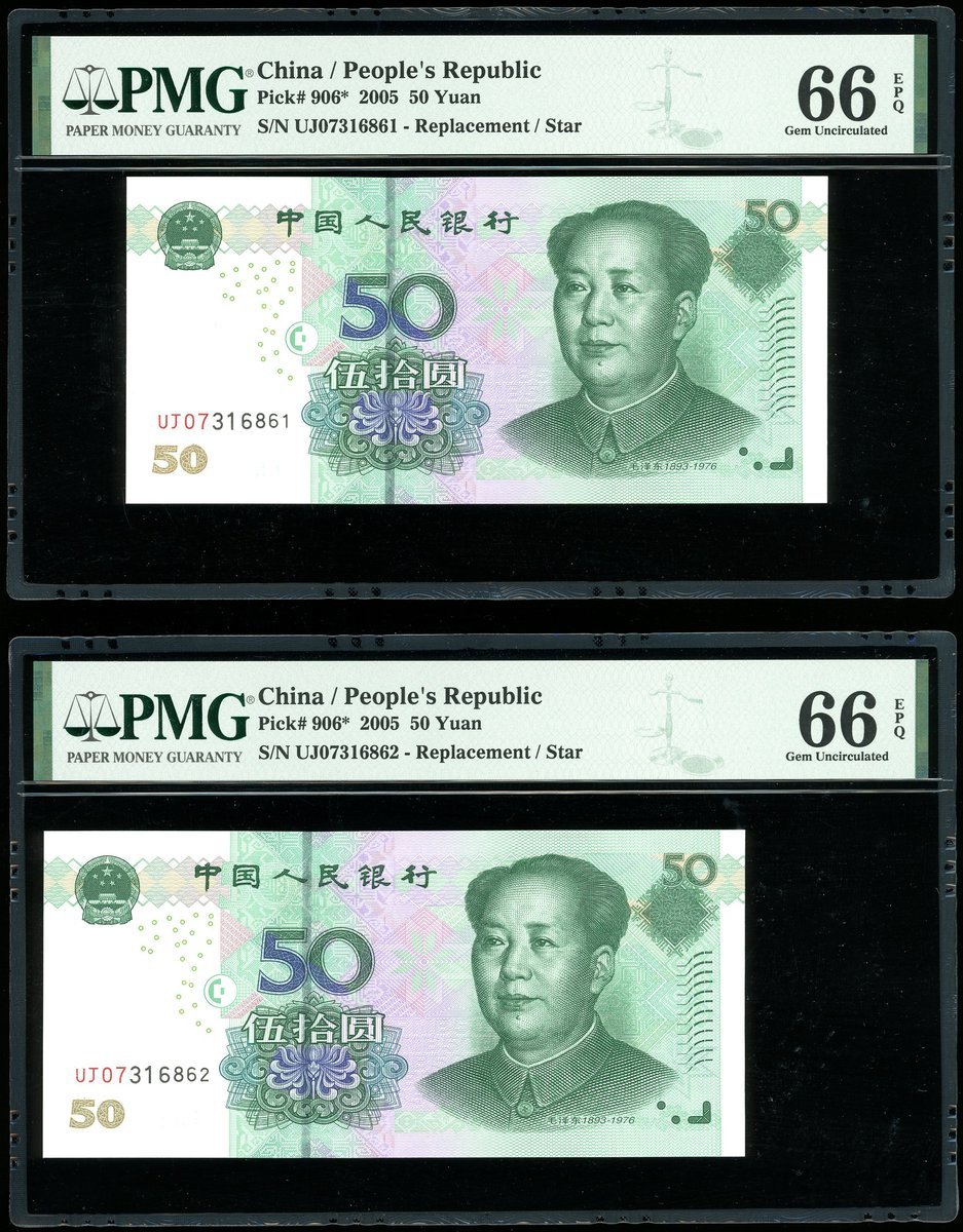 2005年中國人民銀行第五版人民幣50元連號3枚,補號UJ07316861-863,均PMG 66EPQ