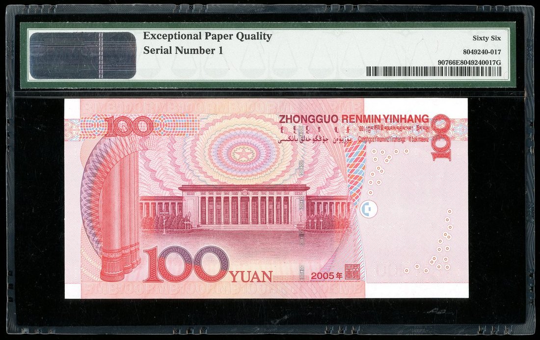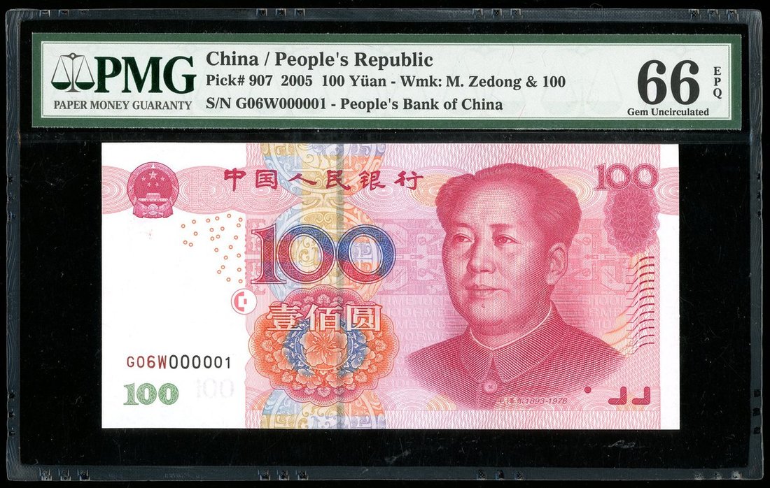 2005年中國人民銀行第五版人民幣100元,幸運號G06W000001,PMG 66EPQ