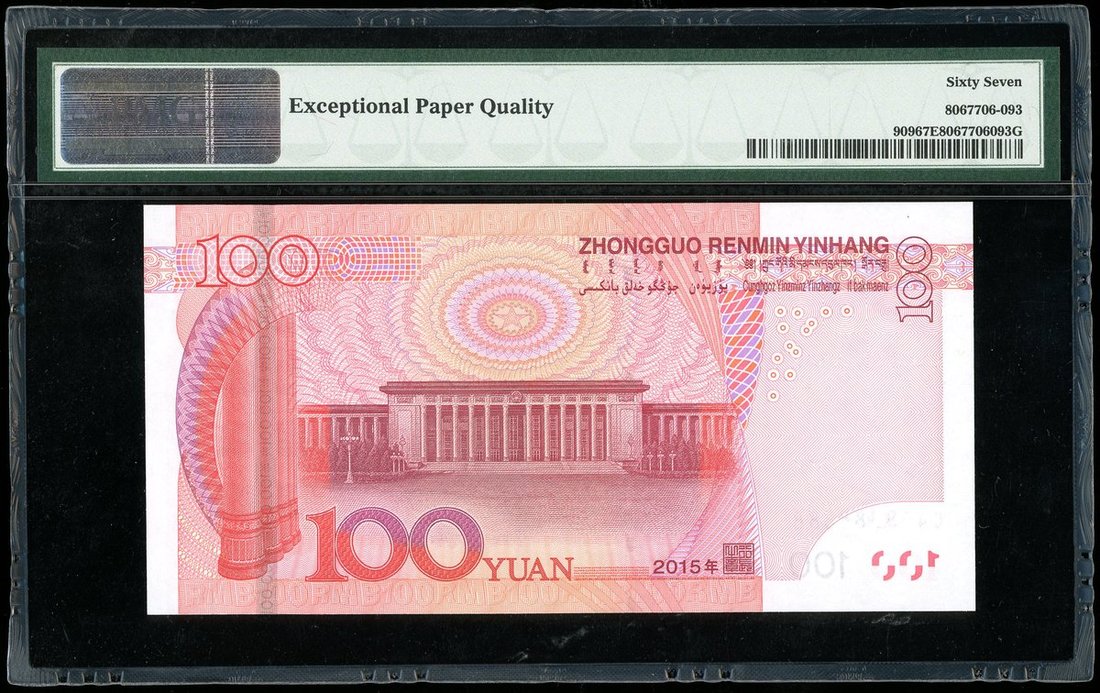 2015年中國人民銀行第五版人民幣100元,幸運號 C4G8888888,PMG 67EPQ,大熱全8!