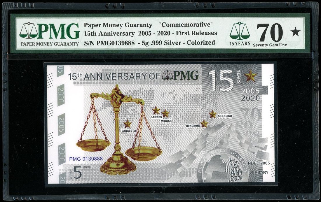 PMG, colourised silver commemorative note for the 15th anniversary of the company, 2020, weighs 3g containing .999 silver, first releases,