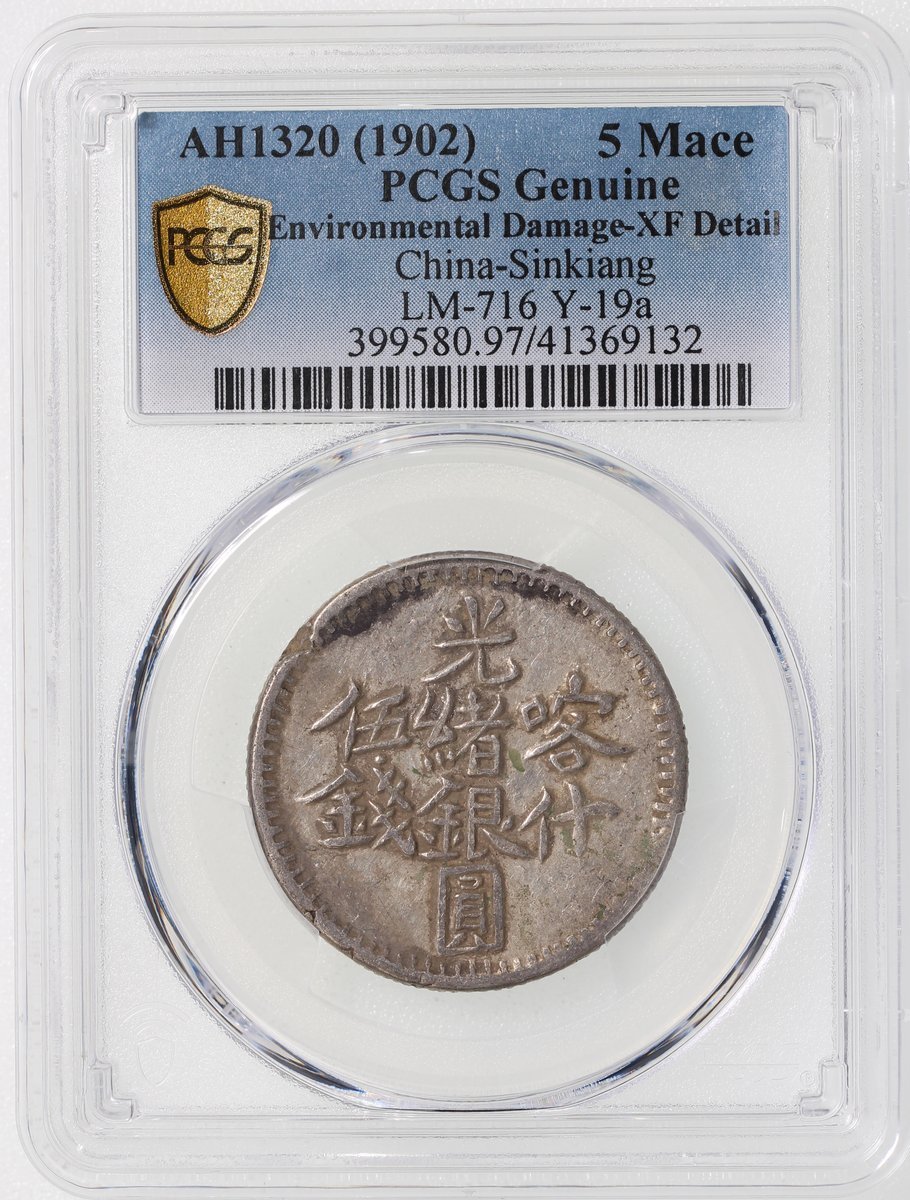 Sinkiang Province, silver 5 mace, AH1320(1902), Kashgar, Guangxu Yin Yuan, (LM-716), PCGS XF detail, enviromental damage.