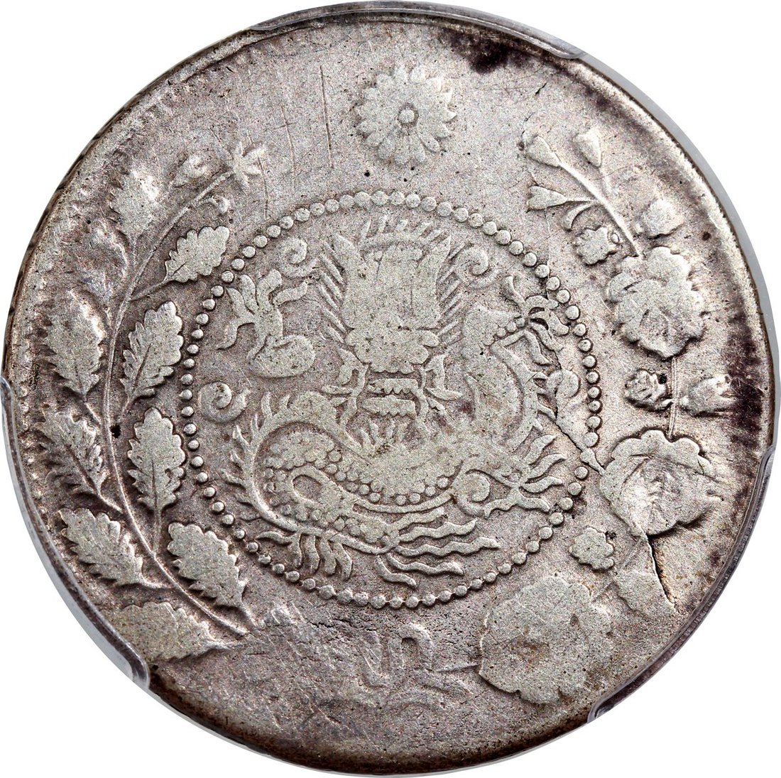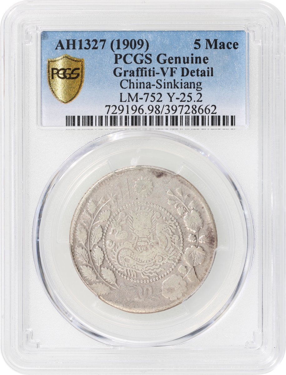 Sinkiang Province, silver 5 mace, A.H. 1327 (1909), 'Xiang Ping Wu Qian', Kashgar Mint, (LM-752, Y-25.2), PCGS Genuine Graffiti - VF Detail