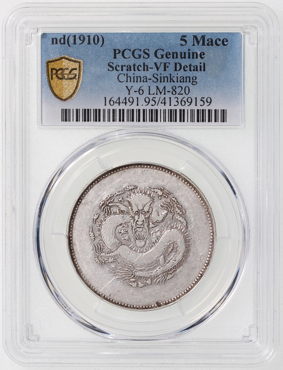 Sinkiang Province, silver 5 mace, ND(1910), dragon without circle on obverse, (LM-820), PCGS VF Detail, scratch.