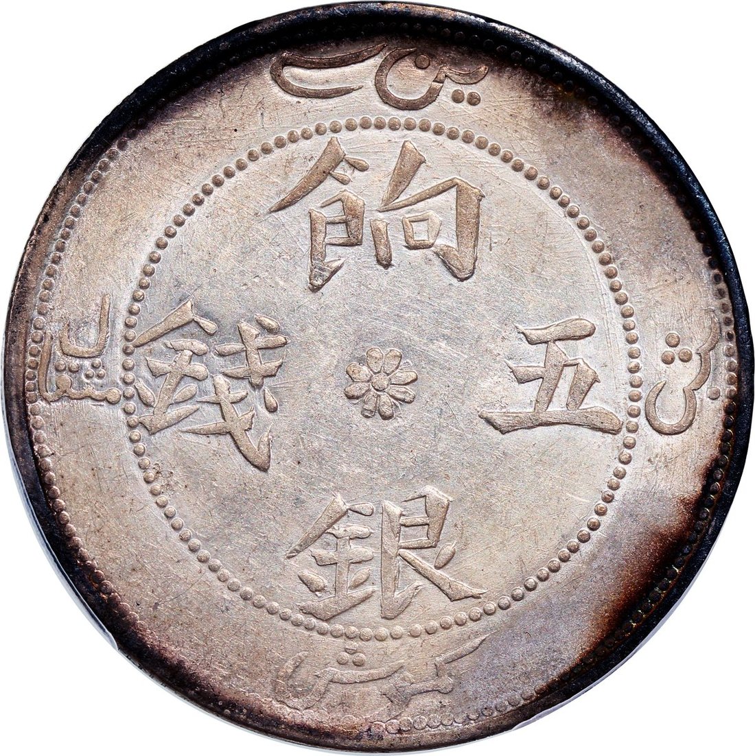 1910年新疆喀什餉銀五錢,「餉」字缺劃,PCGS XF Detail,有環境損害