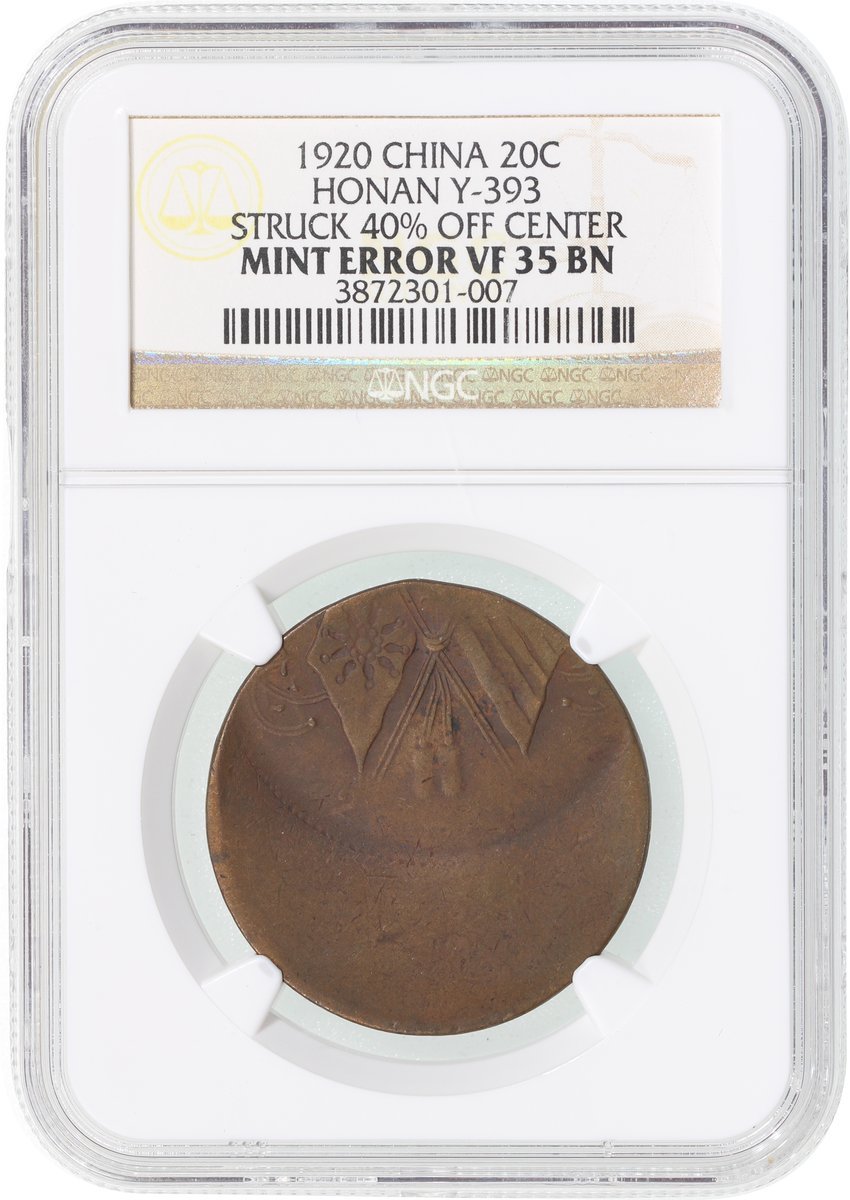 1920年河南省造二十文銅幣,鑄打移位錯體,NGC VF35BN
