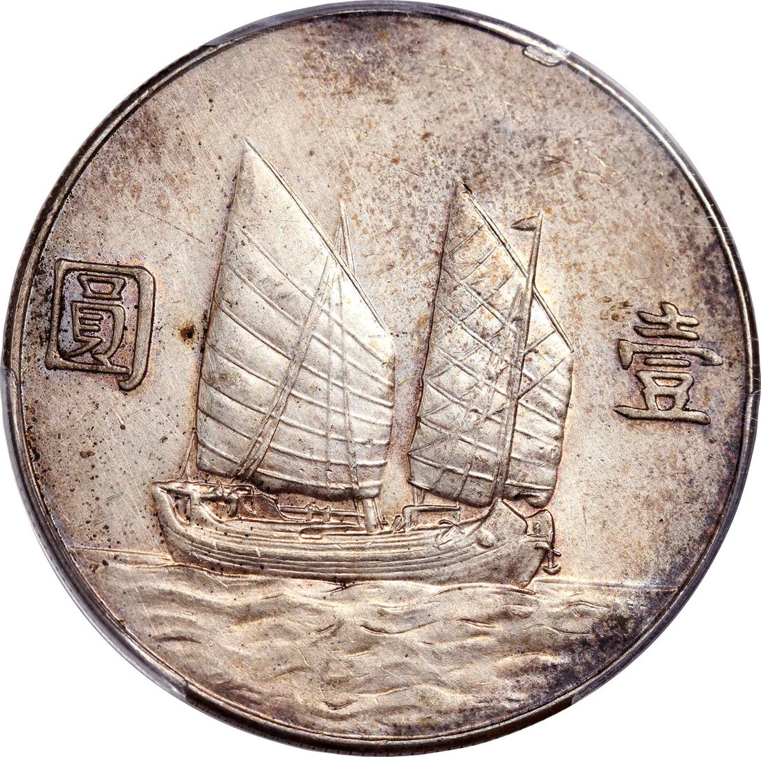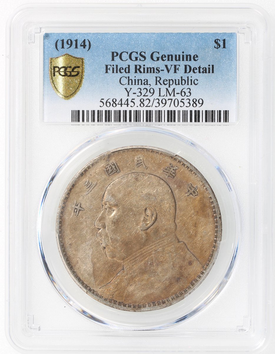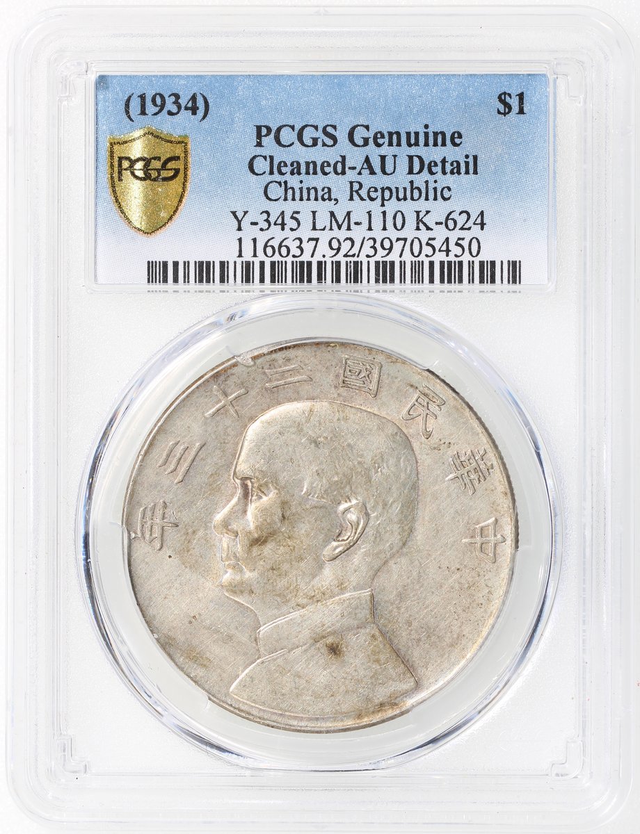 民國三年袁世凱像銀元及二十三年孫中山像帆船壹圓銀幣,分別 PCGS VF Detail (邊緣有挫) 及 AU Detail (有清洗)