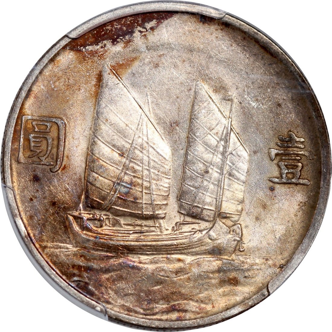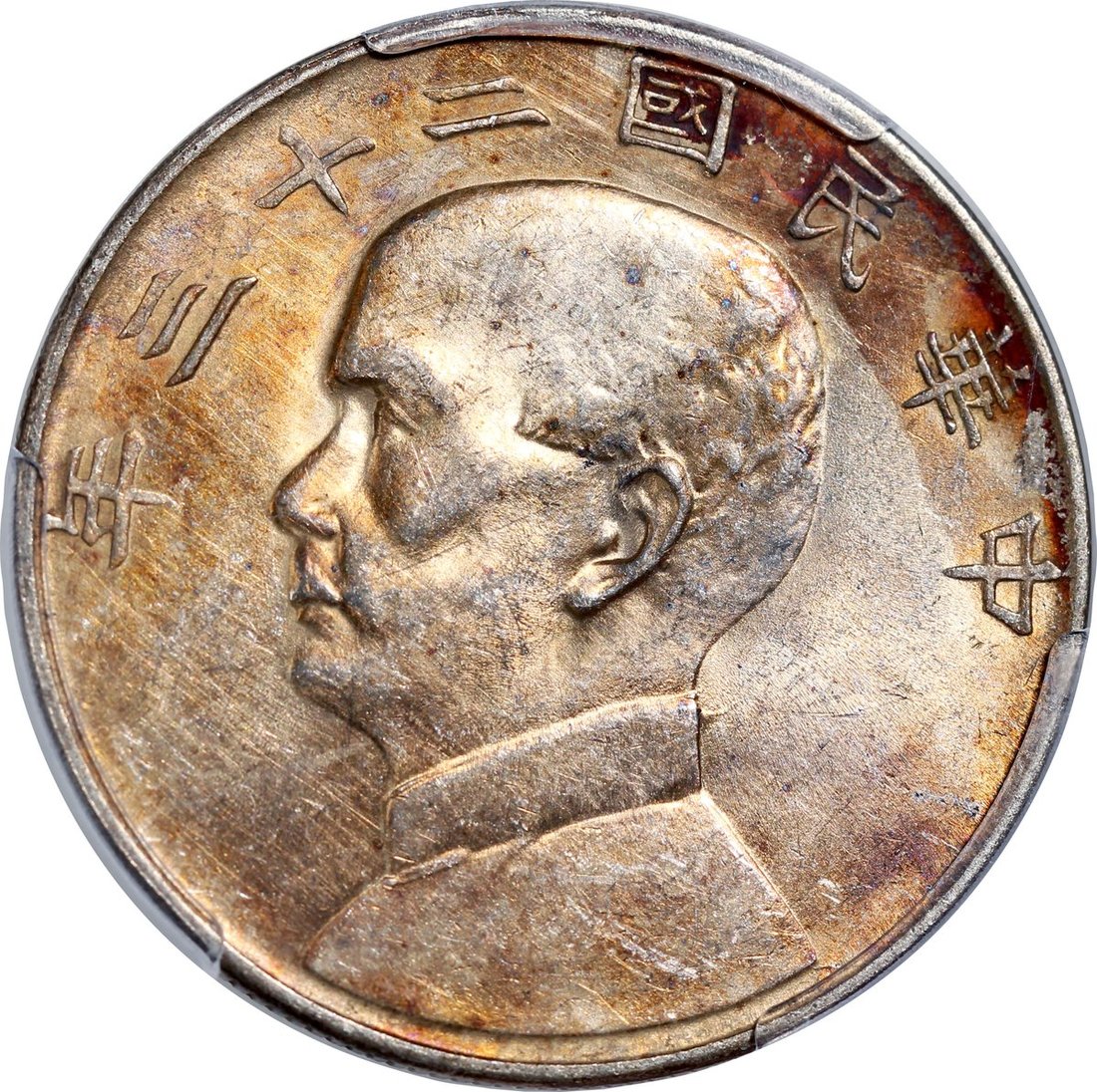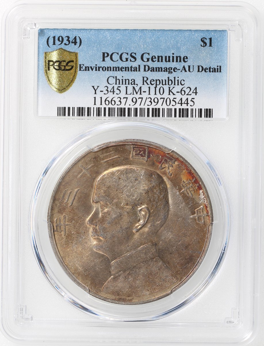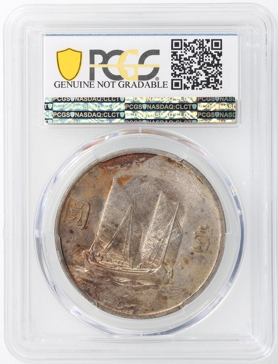民國三年袁世凱像銀元及二十三年孫中山像帆船壹圓銀幣,分別 PCGS VF Detail (有清洗) 及 AU Detail (有環境損害)