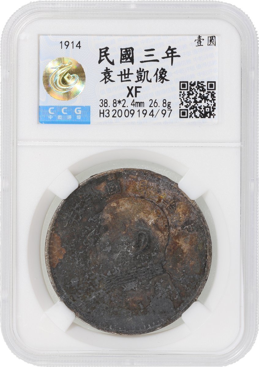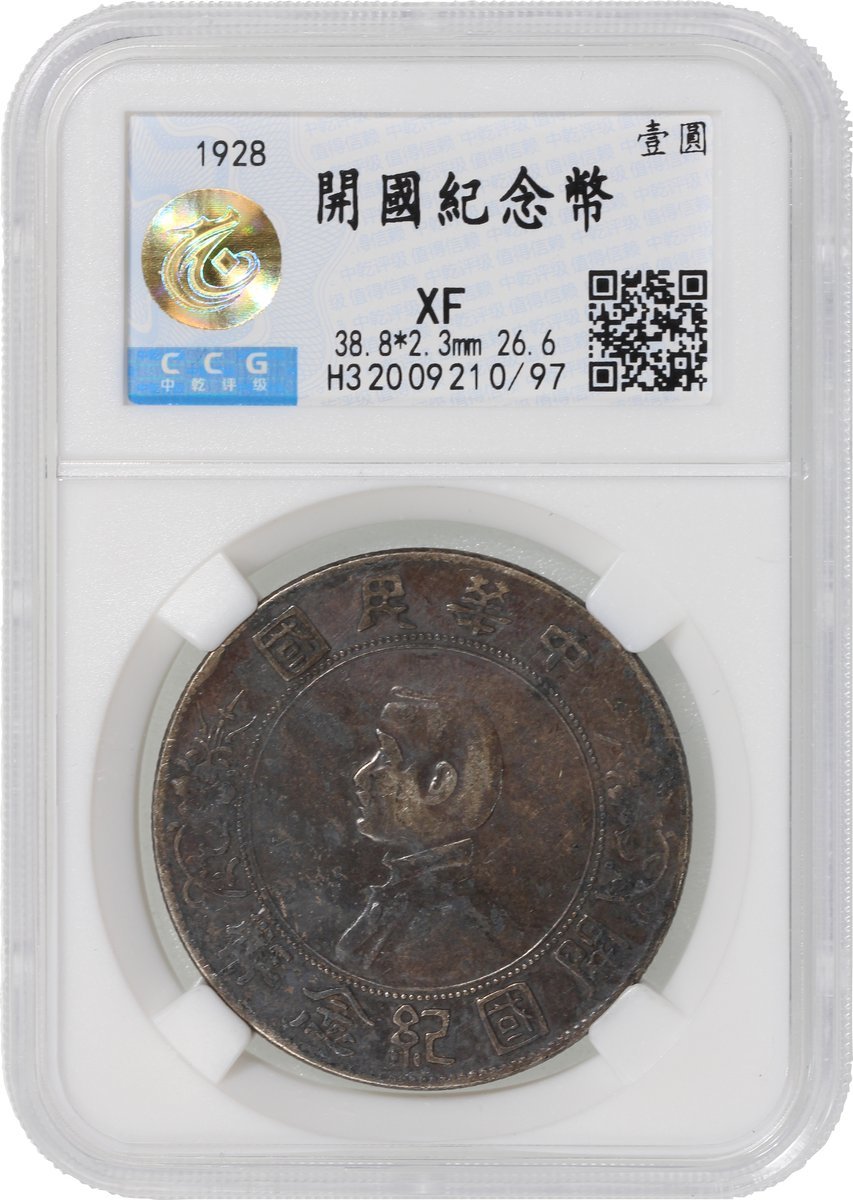 Republic of China, a pair of silver $1, 1914, Yuan Shih Kai, and ND (1928), 'Memento' dollar, both graded Zhong Qian XF, dark toning (2)