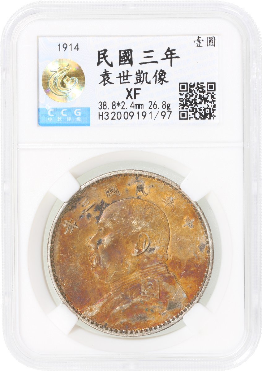 民國三年袁世凱像銀元,及開國紀念銀幣,無日期,均評中乾XF,前者蜜棕色包漿,後者深色包漿