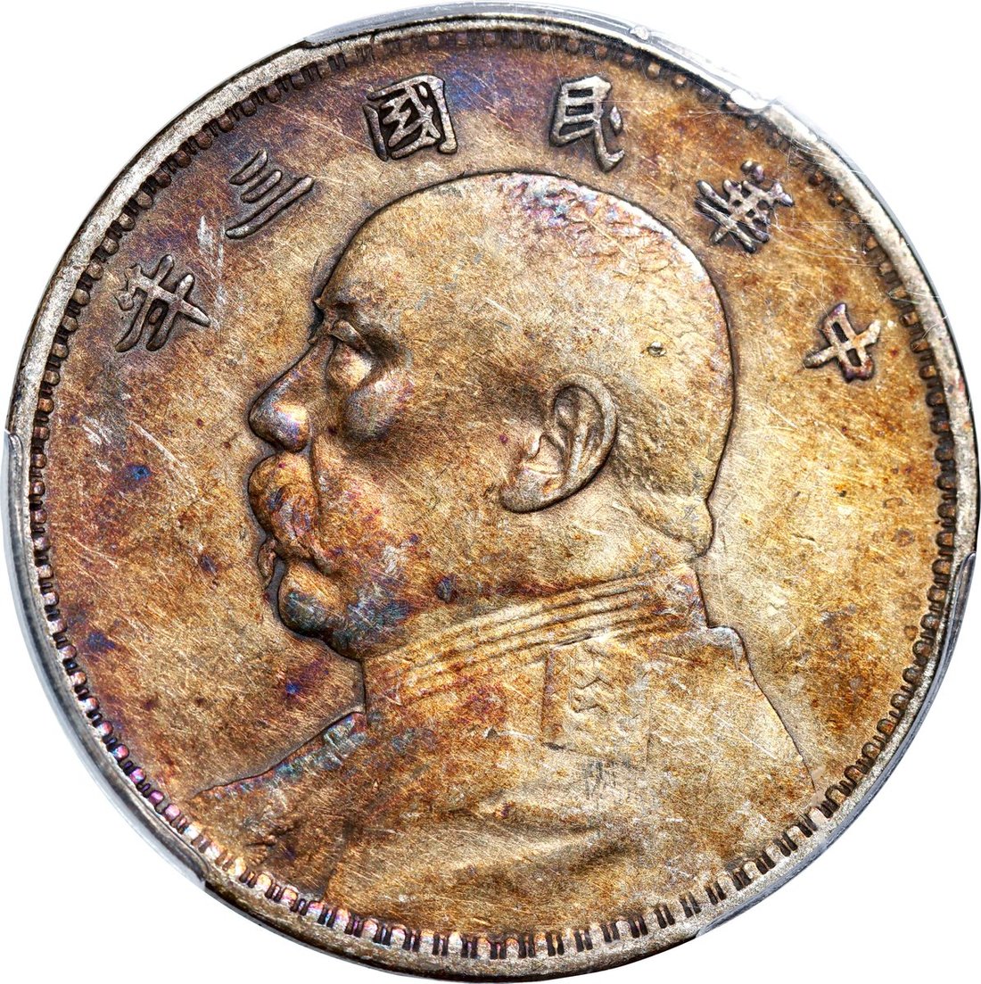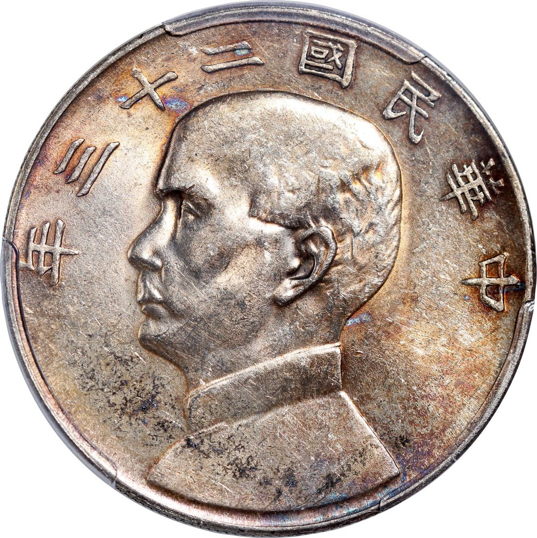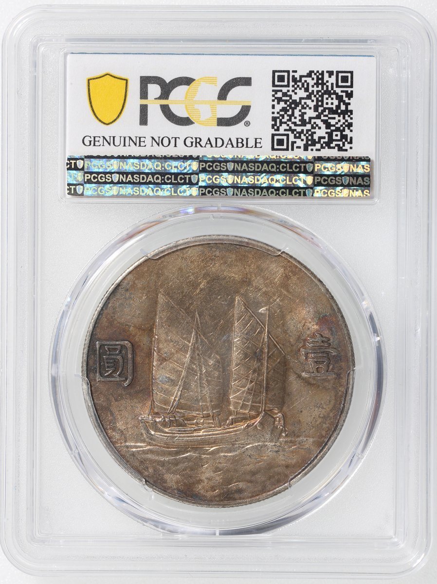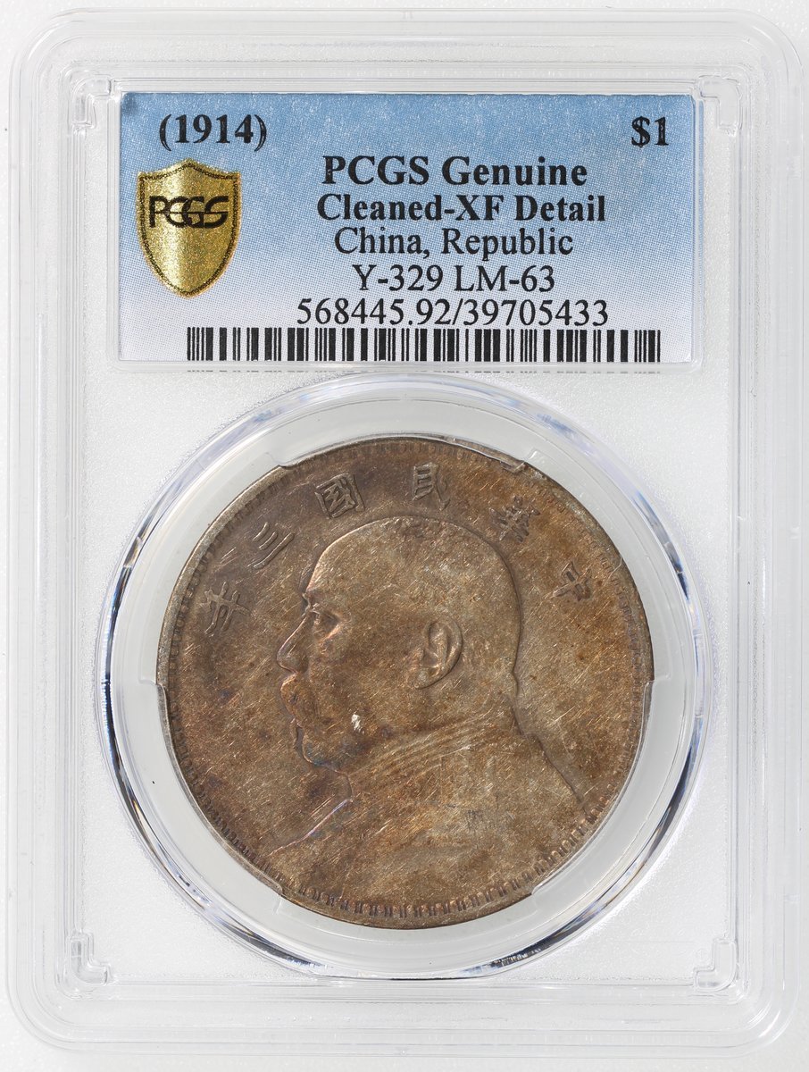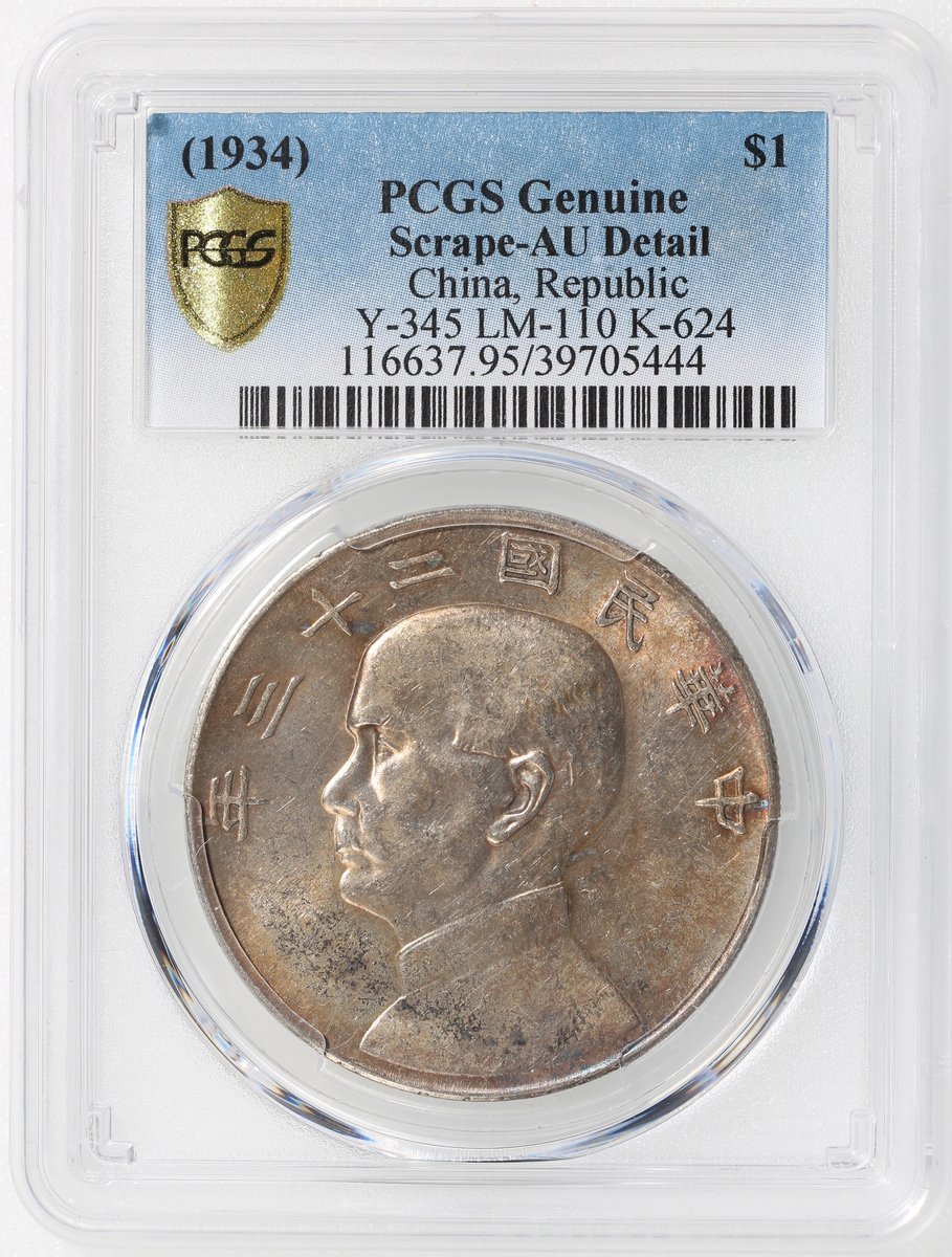 民國三年袁世凱像銀元及二十三年孫中山像帆船壹圓銀幣,分別 PCGS VF Detail (有清洗) 及 AU Detail (有刮痕)
