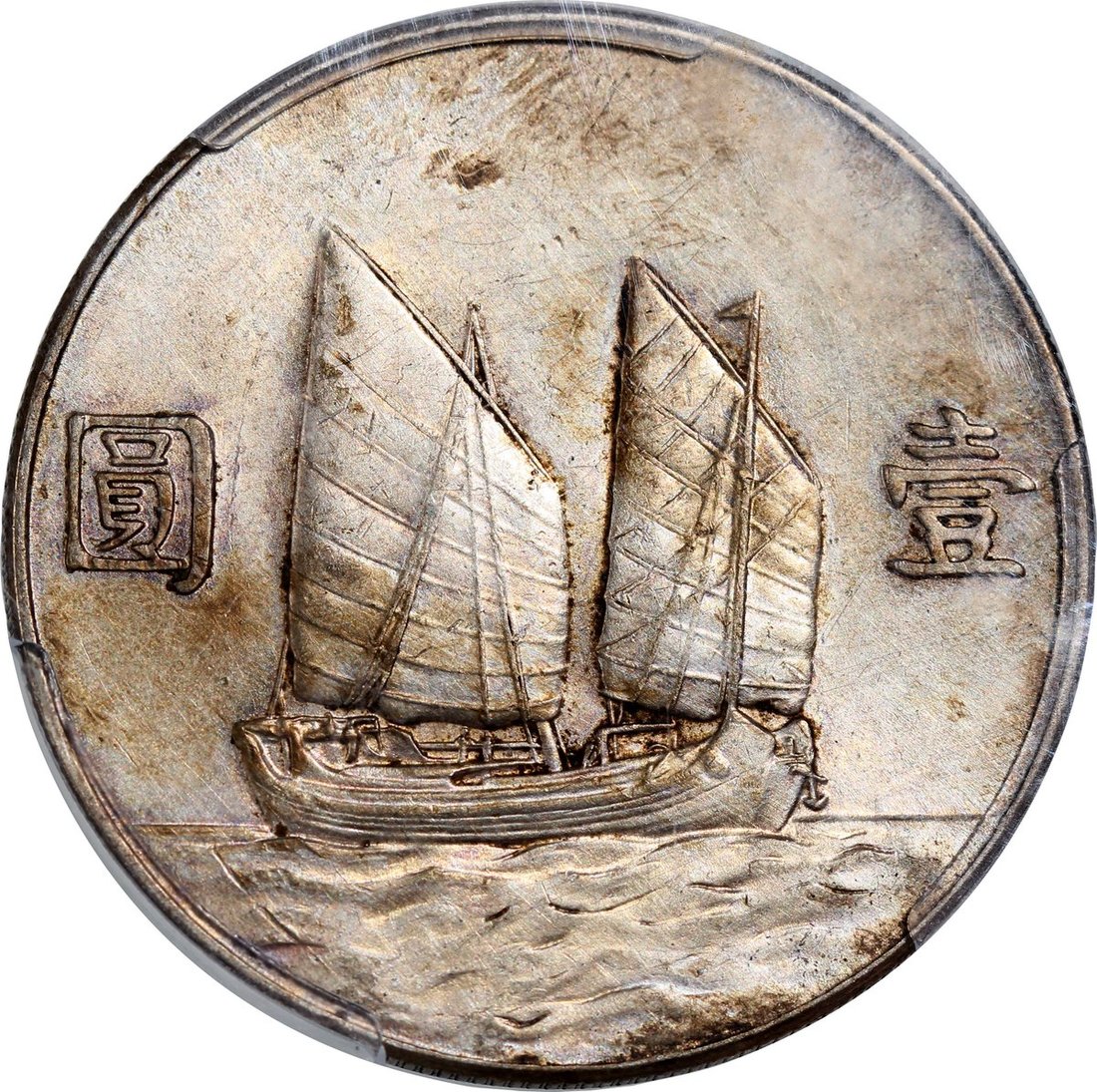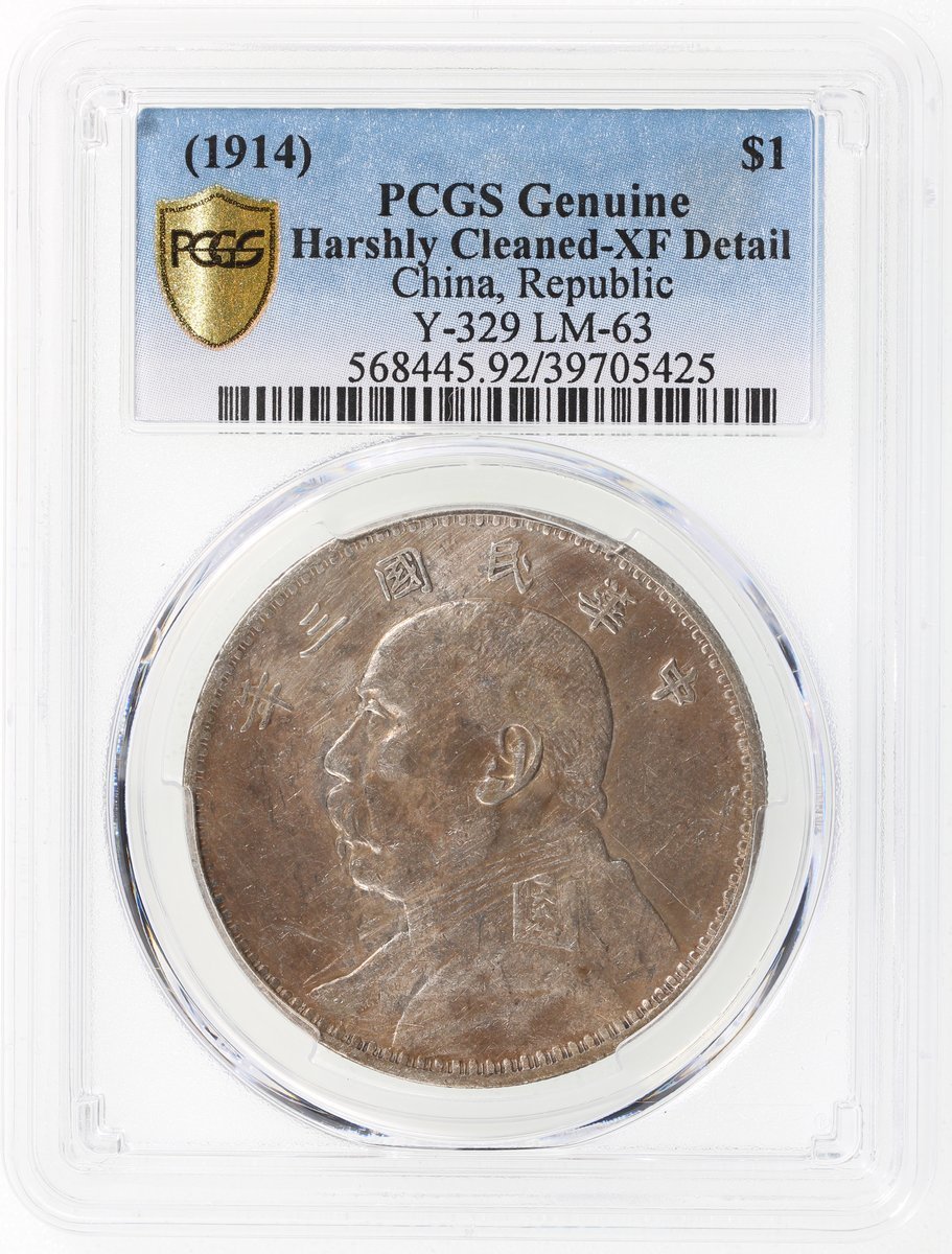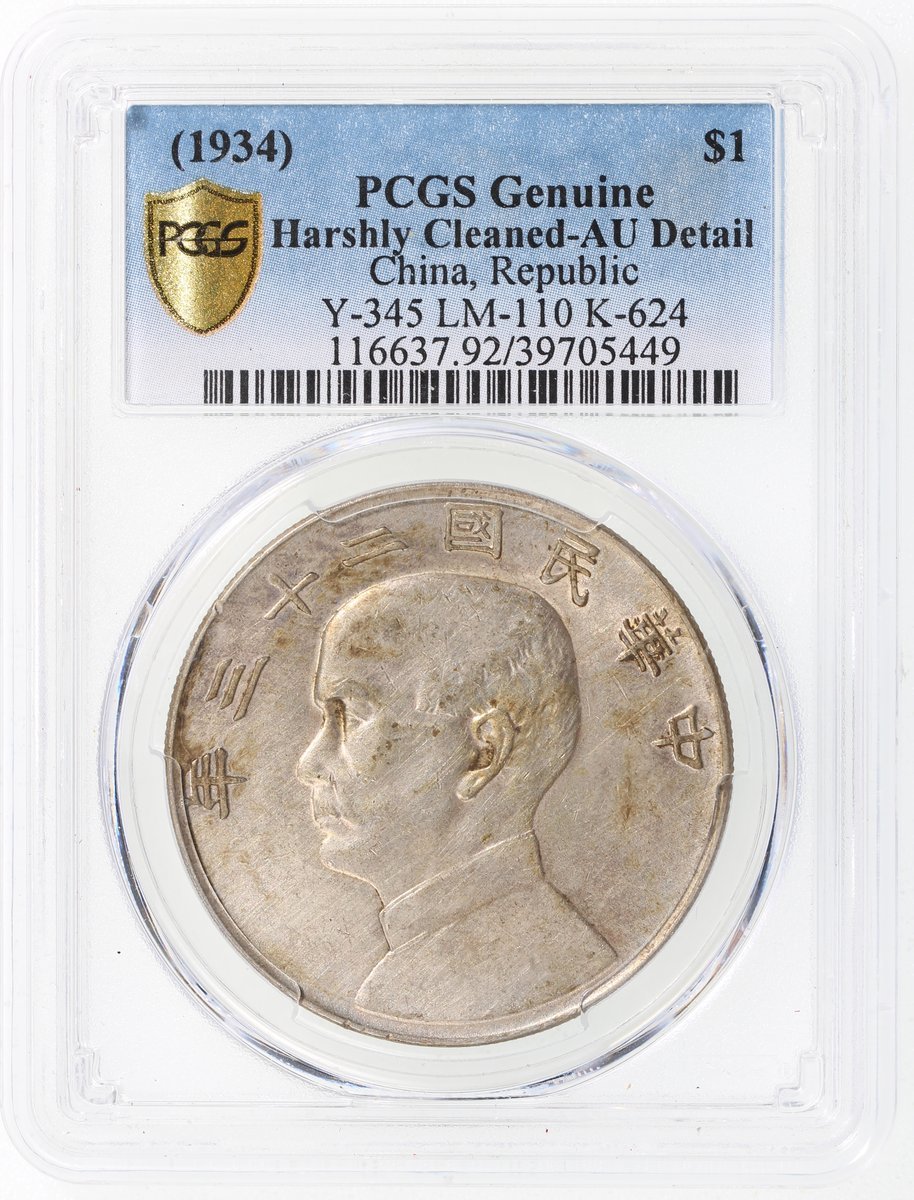 民國三年袁世凱像銀元及二十三年孫中山像帆船壹圓銀幣,分別 PCGS XF Detail 及 AU Detail,均有嚴重清洗