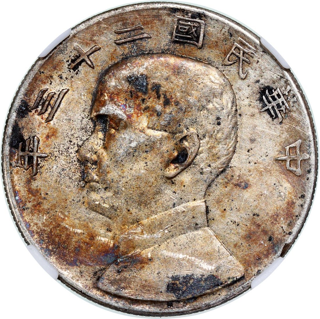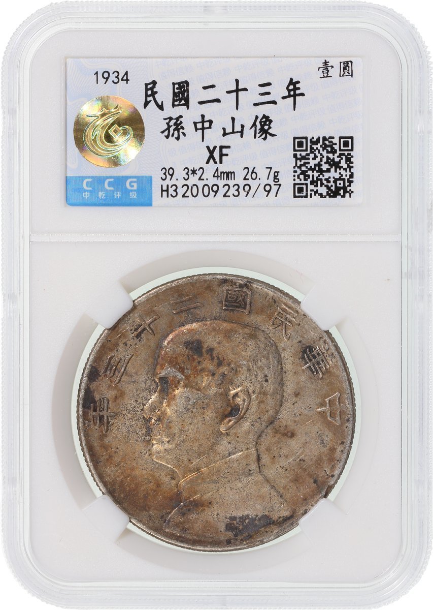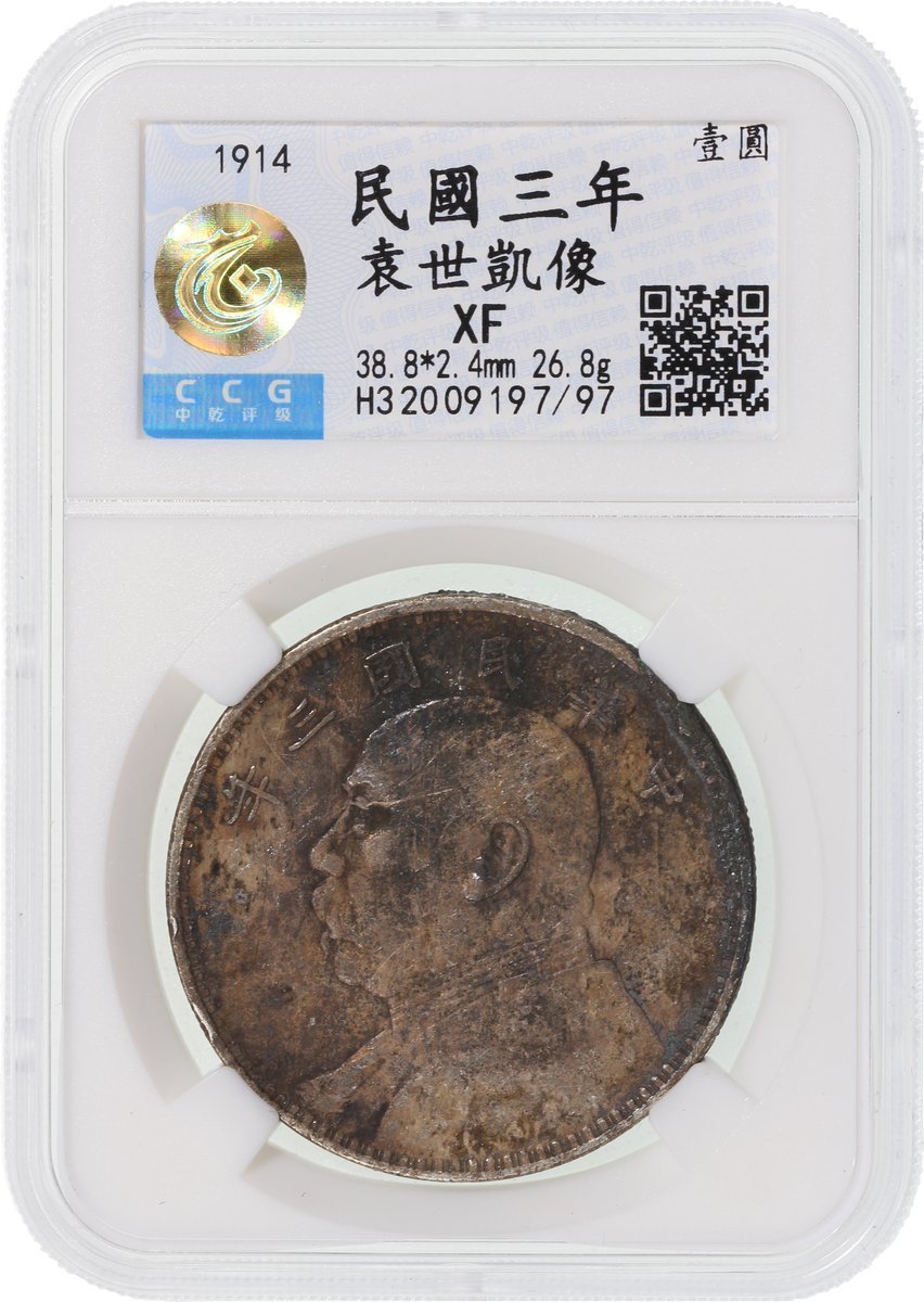 民國三年袁世凱像銀元,及二十三年孫像船洋銀元,均評中乾XF,有包漿