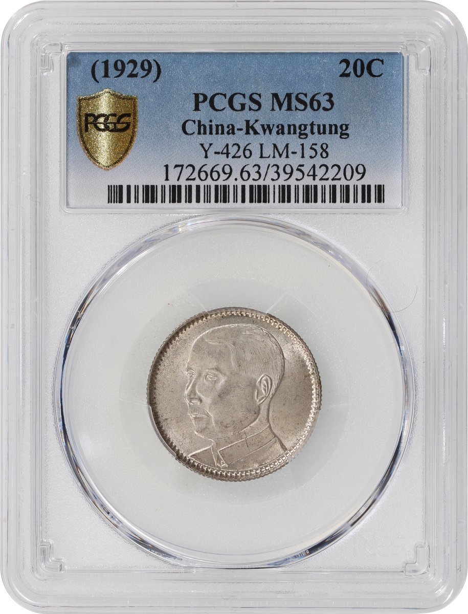 Kwangtung Province, silver 20 cents, 1929, PCGS MS 63
