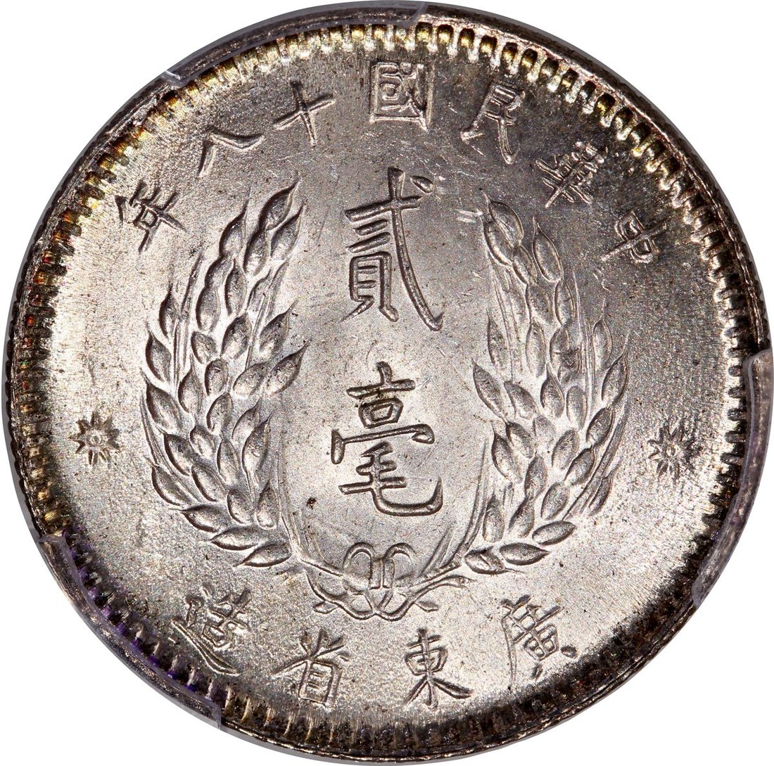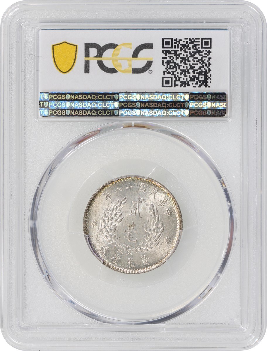 民國十八年廣東省造2毫銀幣,PCGS MS 63
