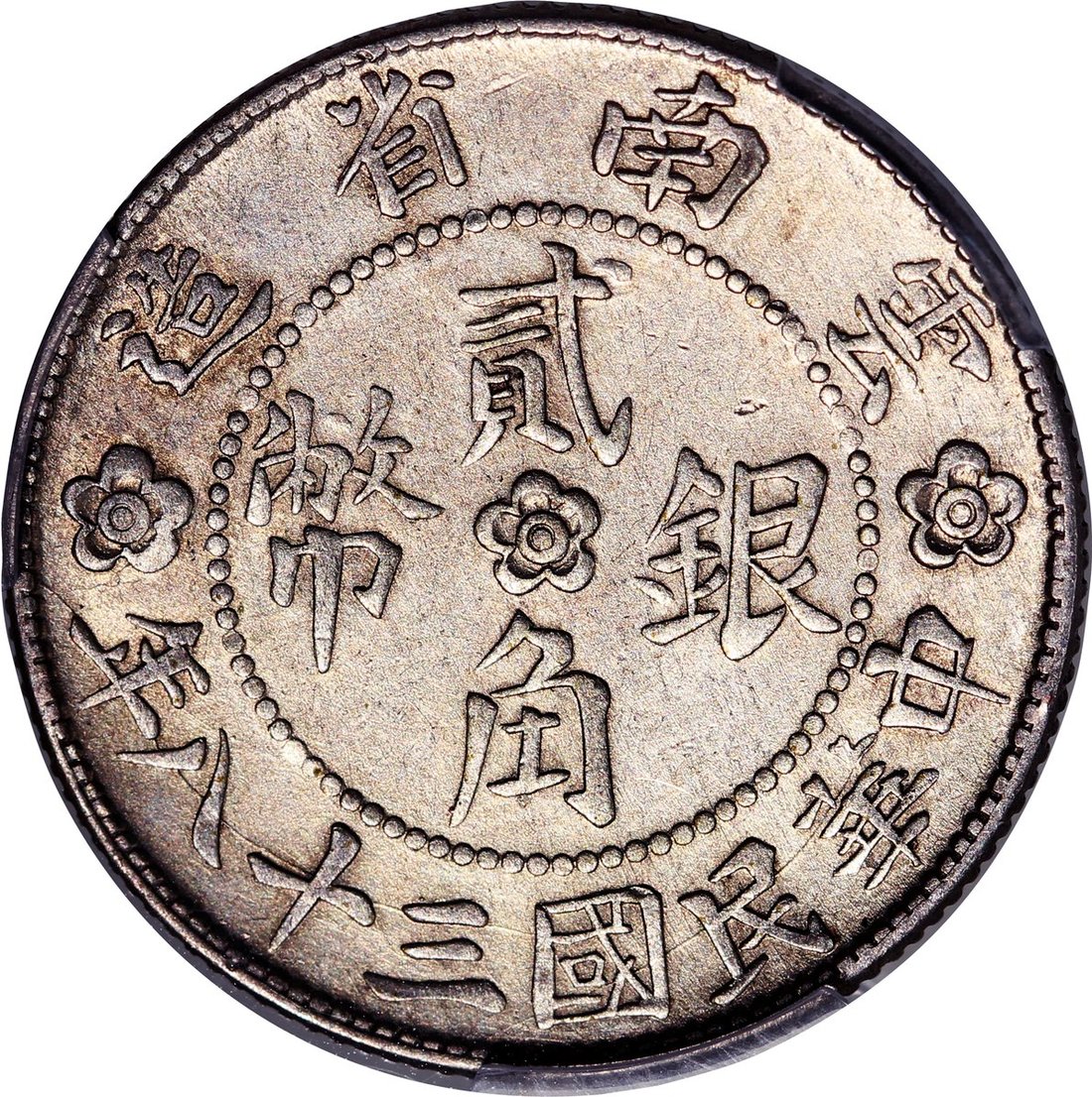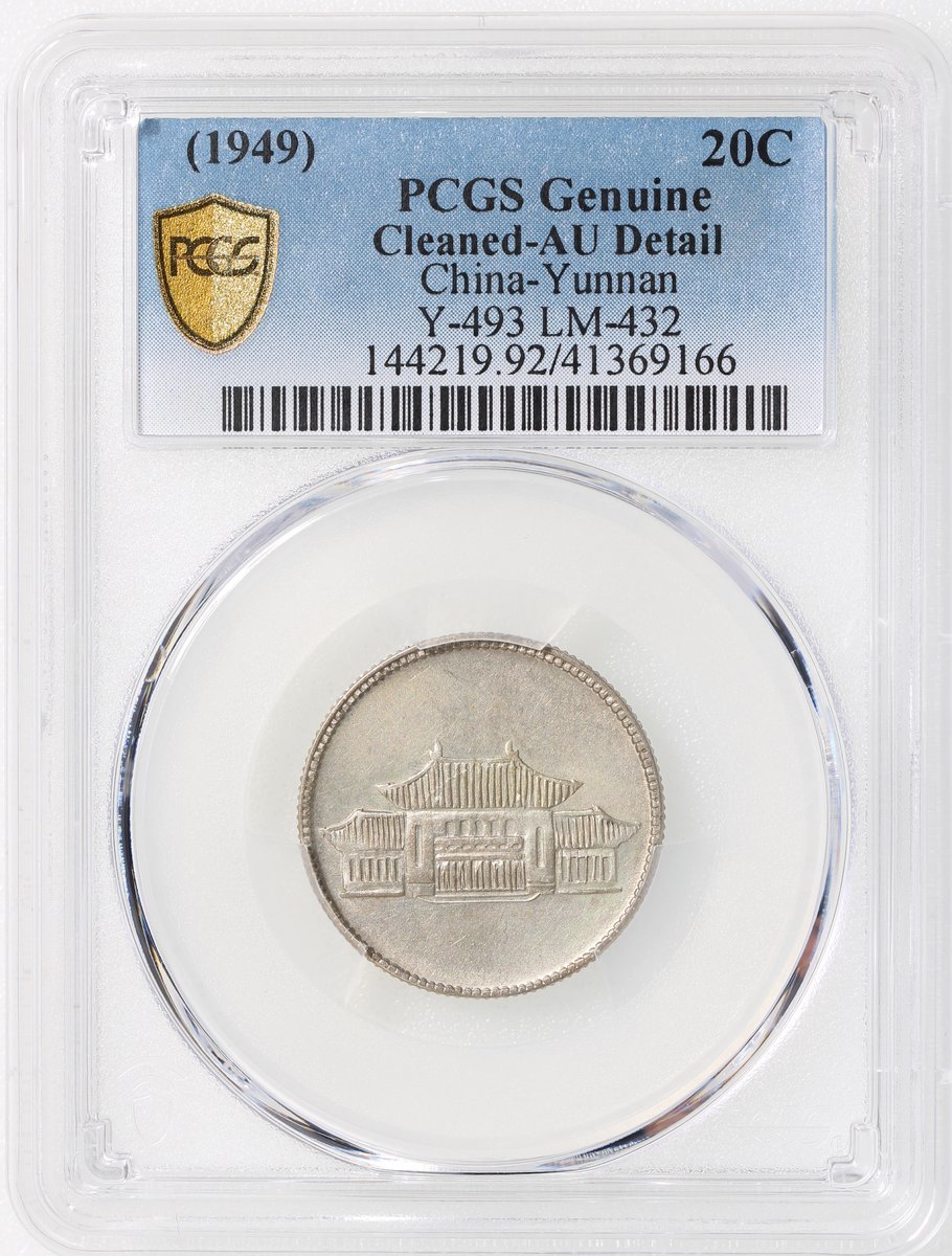 Yunnan Province, silver 20 cents, 1949, Town Hall on obverse, (LM-493), PCGS AU Detail, cleaned.