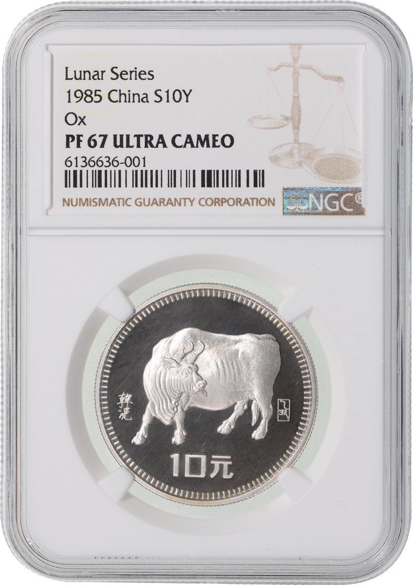 People's Republic of China, silver proof 10 Yuan, 1985, Year of the Ox, NGC PF67 Ultra Cameo, with original box, without certificate