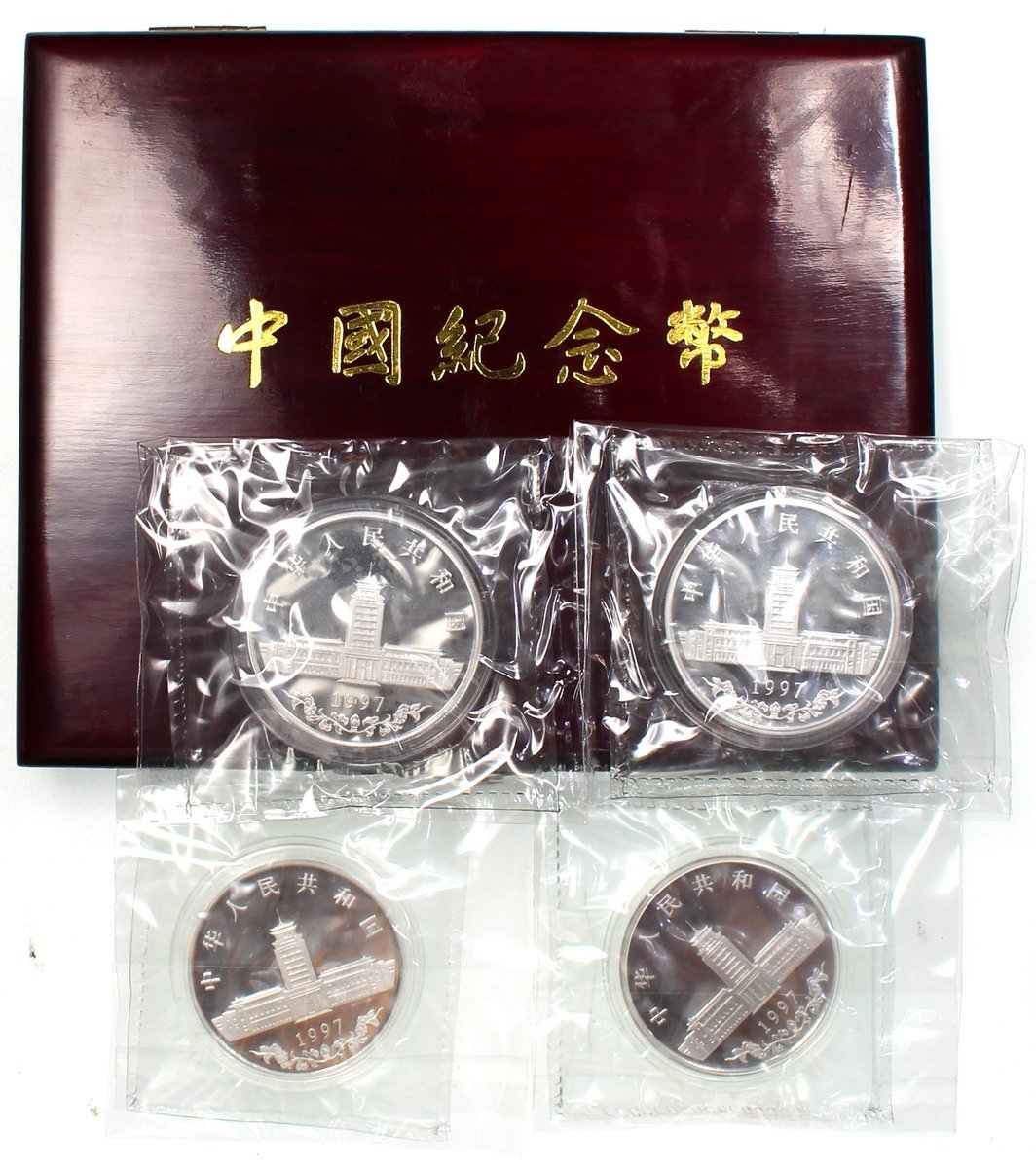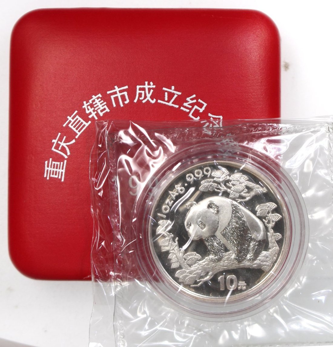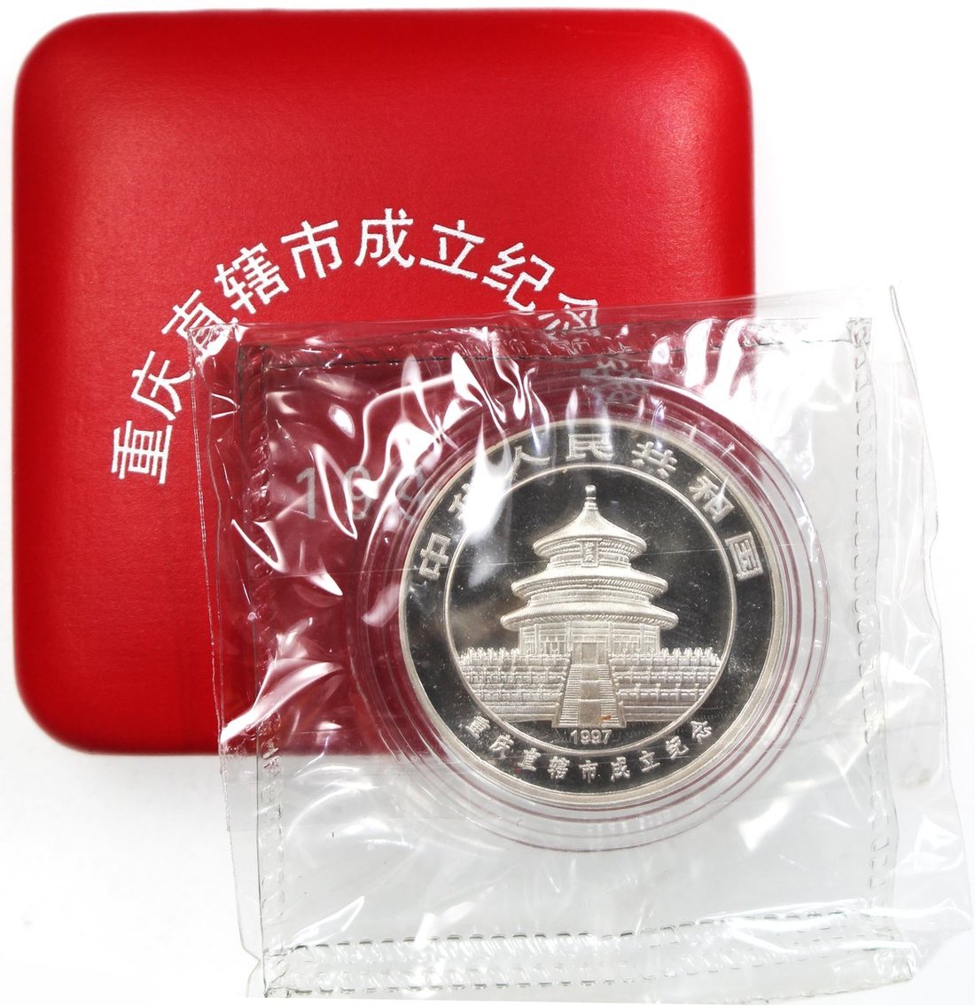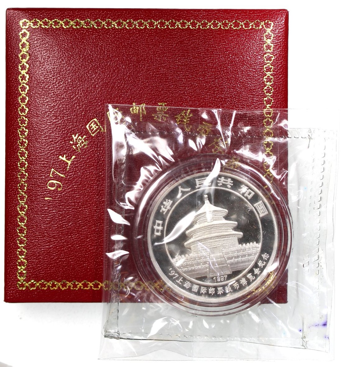 1997年中國紀念銀幣10元一組6枚,包括中國少數民族文化系列一套4枚,「重慶直轄市成立紀念」10元,及「上海國際郵票錢幣博覽會紀念」10元,各重1盎司及含.999銀,總含銀量6盎司,均UNC,連原包裝及證書,編號01278, 0009416 及 02908,分別發行 28000套, 50000 及 30000枚