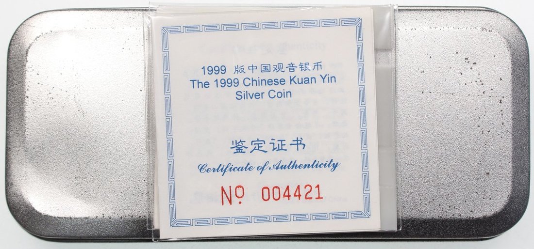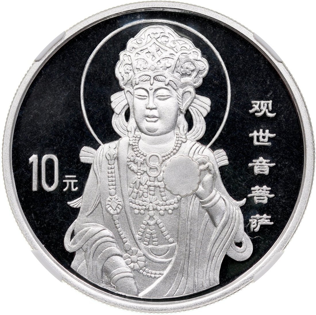 People's Republic of China, a pair of silver 10 Yuan, 1999, each weighs 1oz containing .999 silver, 'Guanyin with Mirror' and 'Guanyin with Fan',
