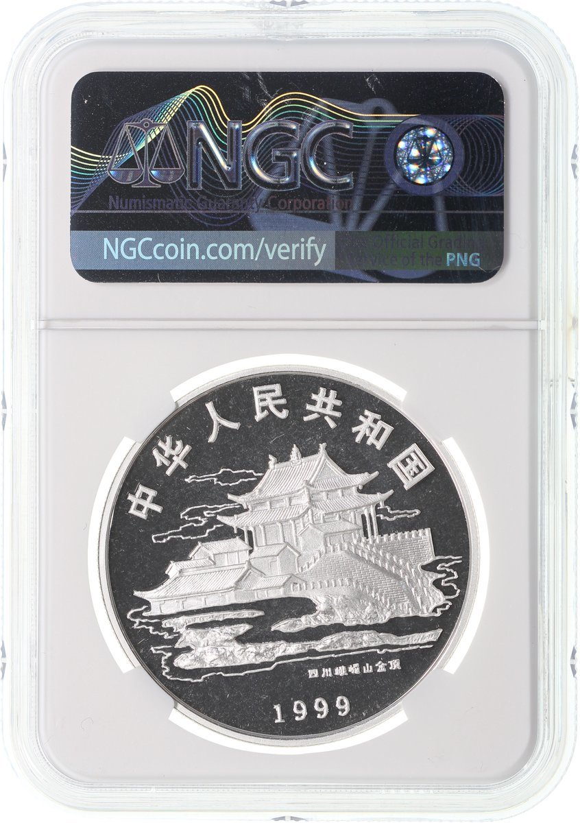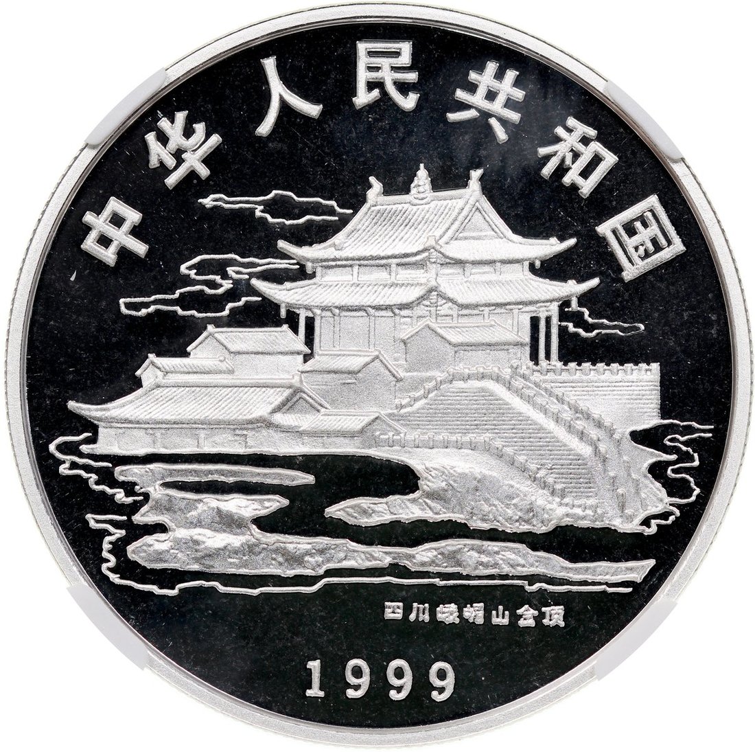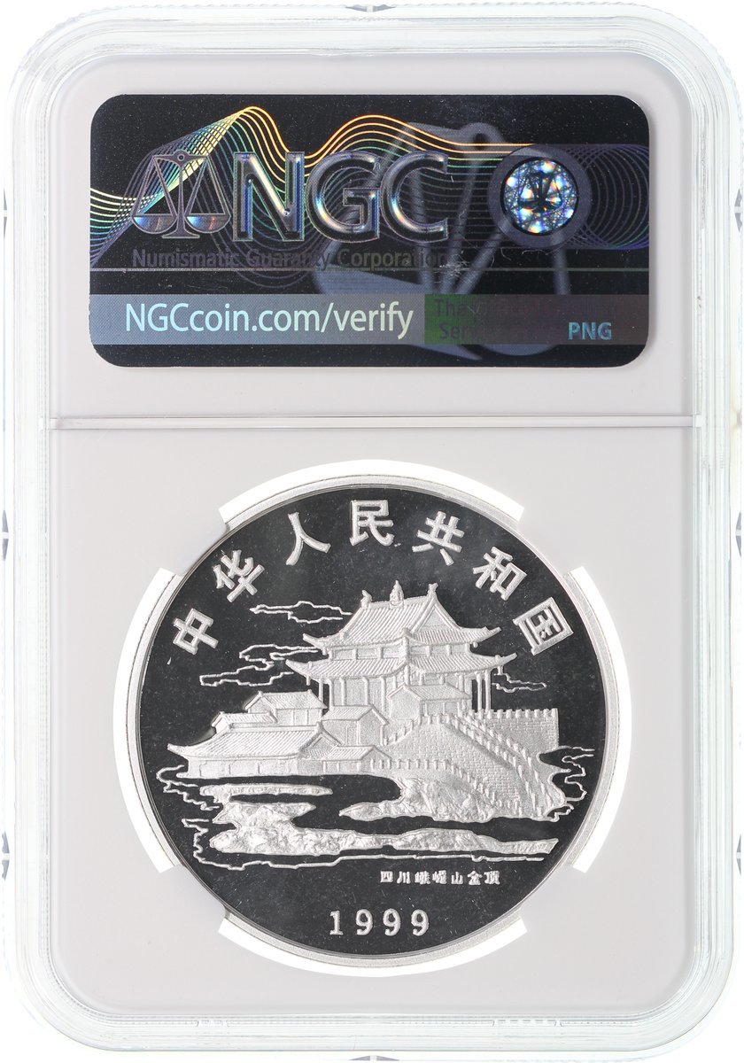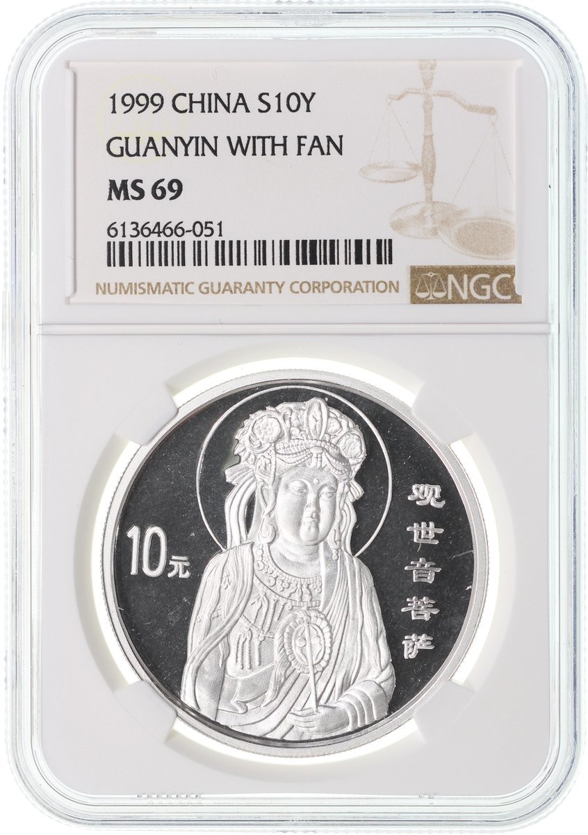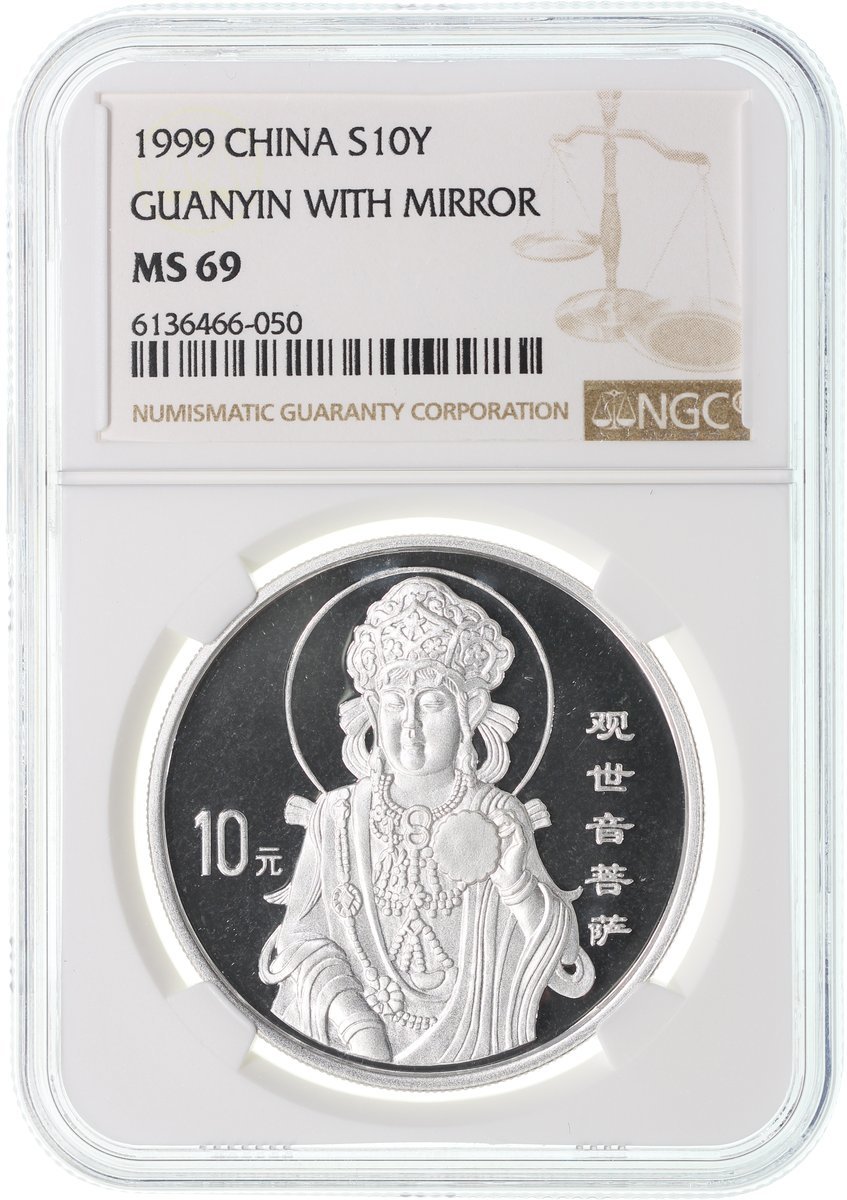 1999年中國觀音銀幣10元一對,「觀音捧鏡」及「觀音提扇」,各重1盎司含.999銀,均NGC MS69,連原包裝及證書,編號004121 及 004421,各發行60000枚