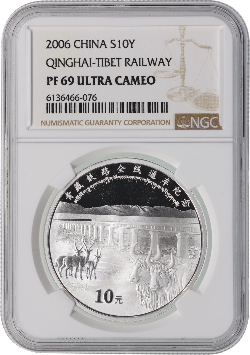 2006年中國「青藏鐵路全線通車」精鑄銀幣10元,重1盎司,含.999銀,NGC PF69 Ultra Cameo,連原包裝及證書,編號035689,發行36000枚