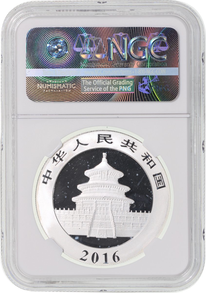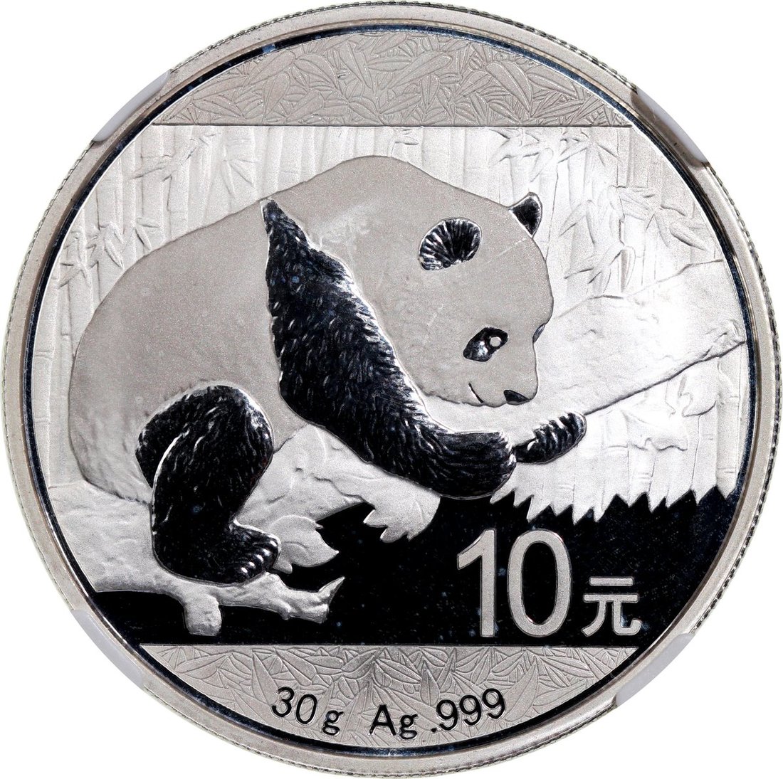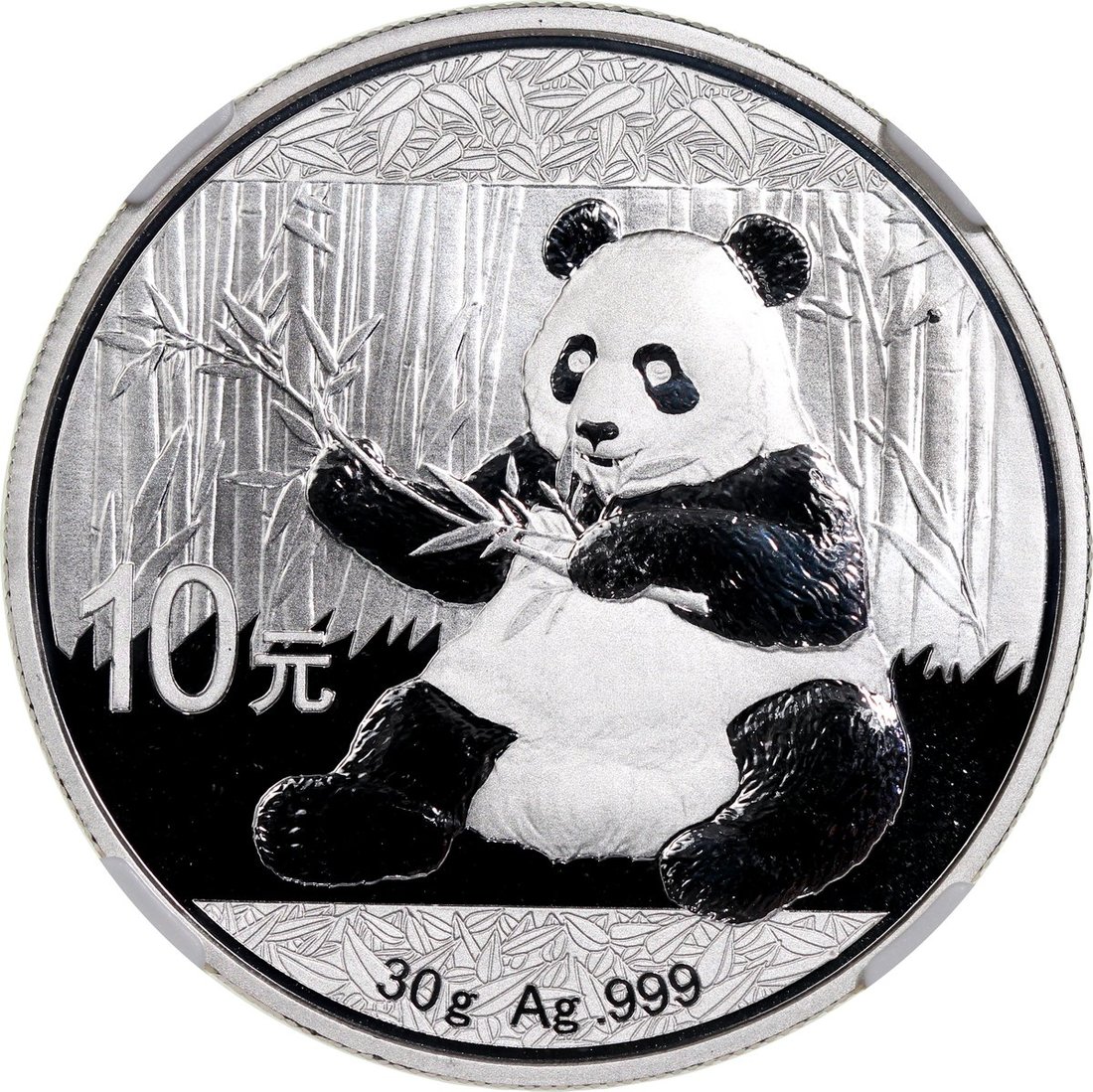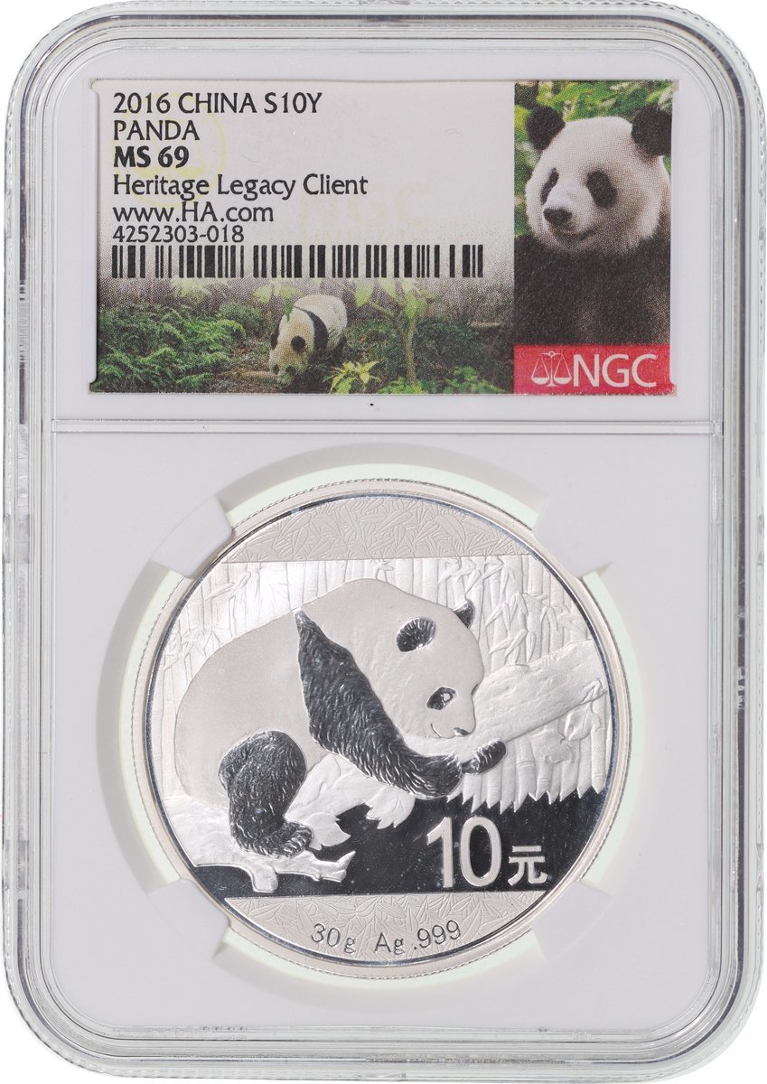 China, a lot of 2x silver Panda 10 yuan, 2016 and 2017, together with a bi-metallic 10 yuan, Year of Monkey, 2016, the first two graded NGC MS69, the third MS 67 PL.(3)