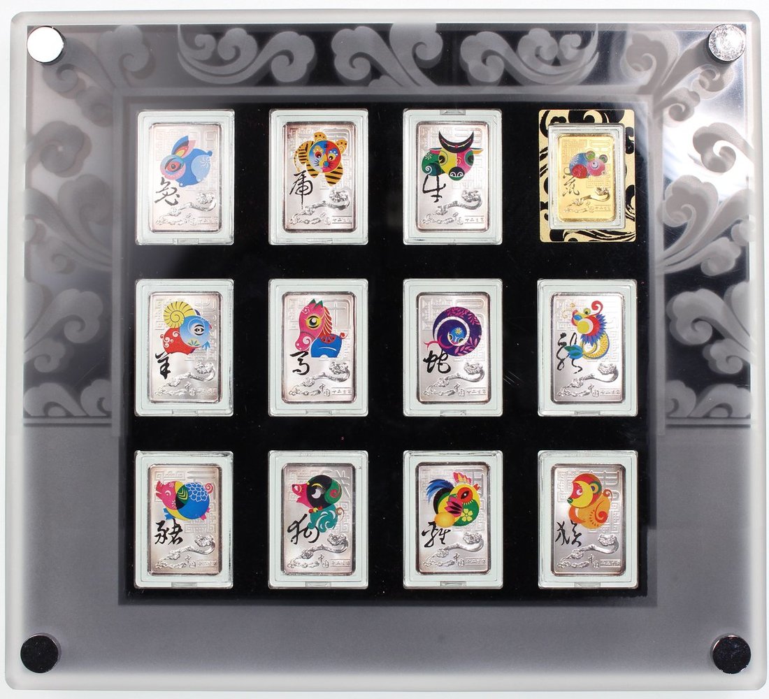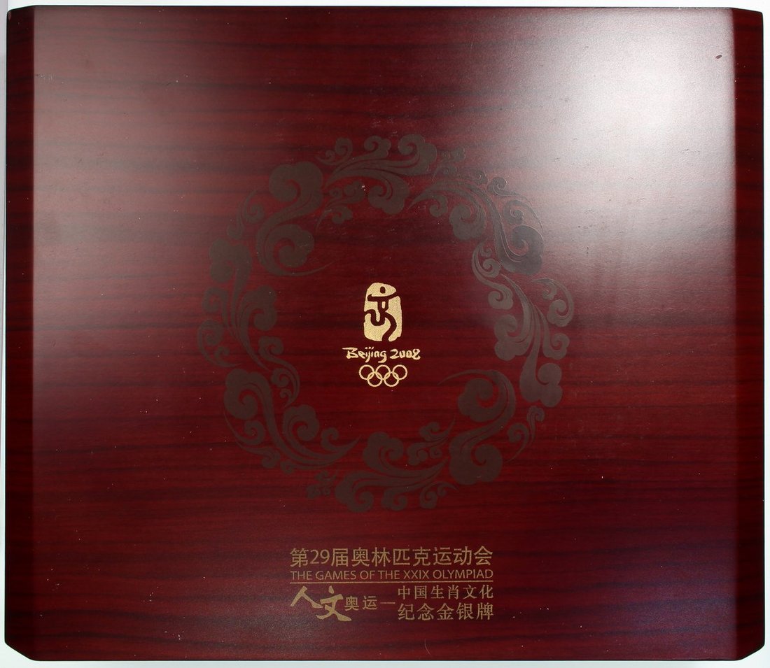 第29屆奧林匹克運動會人文奧運–中國生肖文化紀念金銀牌一套12枚,各有十二生肖圖案,1枚金章及11枚銀章,總含金量0.3盎司,含銀量3.5盎司,proof FDC,輕微氧化,連原盒及證書,編號01814,發行30000套