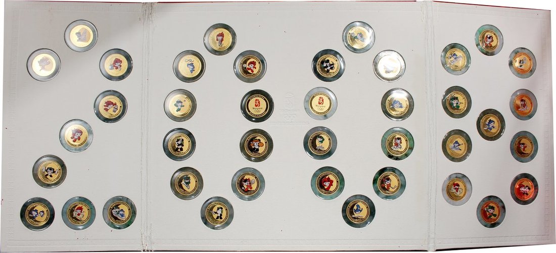 People's Republic of China, 2x sets of commemorative medallions for the Beijing Olympics, 2008, one set of 40x commemorative gold medallions gilded in jade, in total weighs 40g (1.3oz) containing .999 gold, the second set containing 38x silver medallions, each weighs 1.54g containing .999 silver, total 58.52g (1.88oz) ASW, both sets of coins feature the Beijing Olympic 'Fuwa' mascots and the respective Olympic sports,