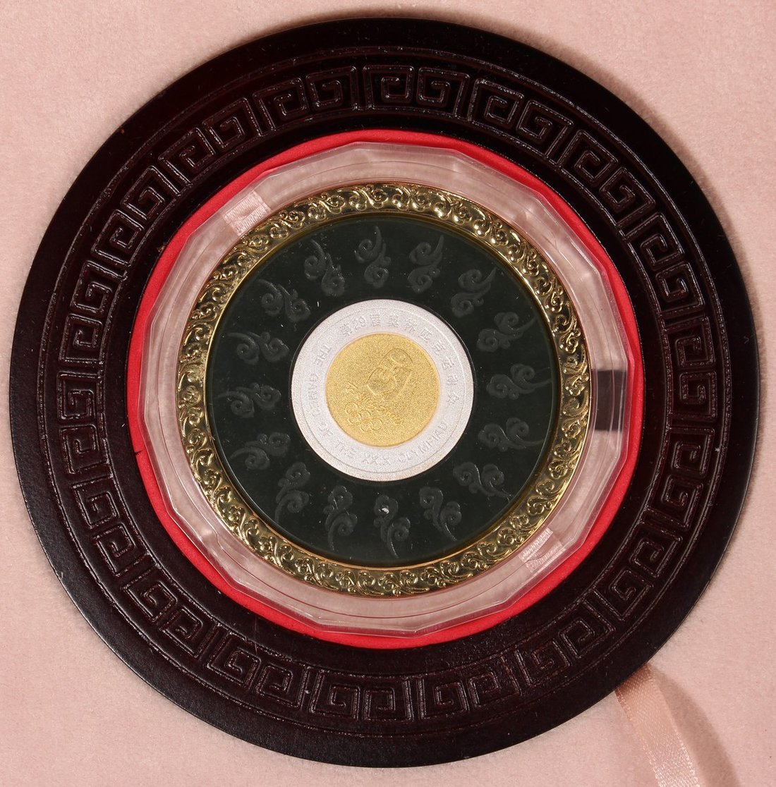 People's Republic of China, commemorative set of 3x gold and silver medals gilded in jade for the Beijing Olympics, 2008, each containing 2.9g gold and 38g silver, both of .999 fineness, obverse designs of the Bird's Nest, the Temple of Heaven and the logo for the Beijing Olympics, in total 8.7g (0.28oz) AGW and 114g (3.67oz) ASW,