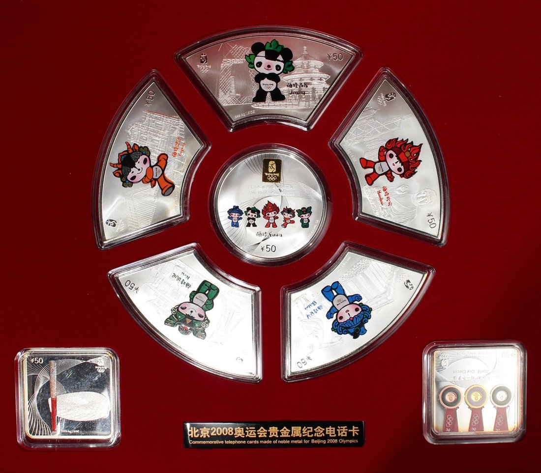 People's Republic of China, 2x sets of commemorative precious metal telephone cards for the Beijing Olympics, 2008, one set of 8 coloured silver 50 Yuan, fan shaped (5), round shaped (1) and square shaped gold gilt silver coins (2), each weighs 1.5oz containing .999 silver,