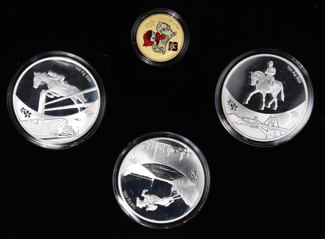 People's Republic of China, a gold and silver medals commemorative set for the Equestrian Programme of the Beijing Olympics, 2008, consisting of 1x gold, coloured Fuwa on horseback at obverse, weighs 1/4oz containing .999 gold, and 3x silver, weighs 1oz containing .999 silver each, in total 1/4oz AGW and 3oz ASW,