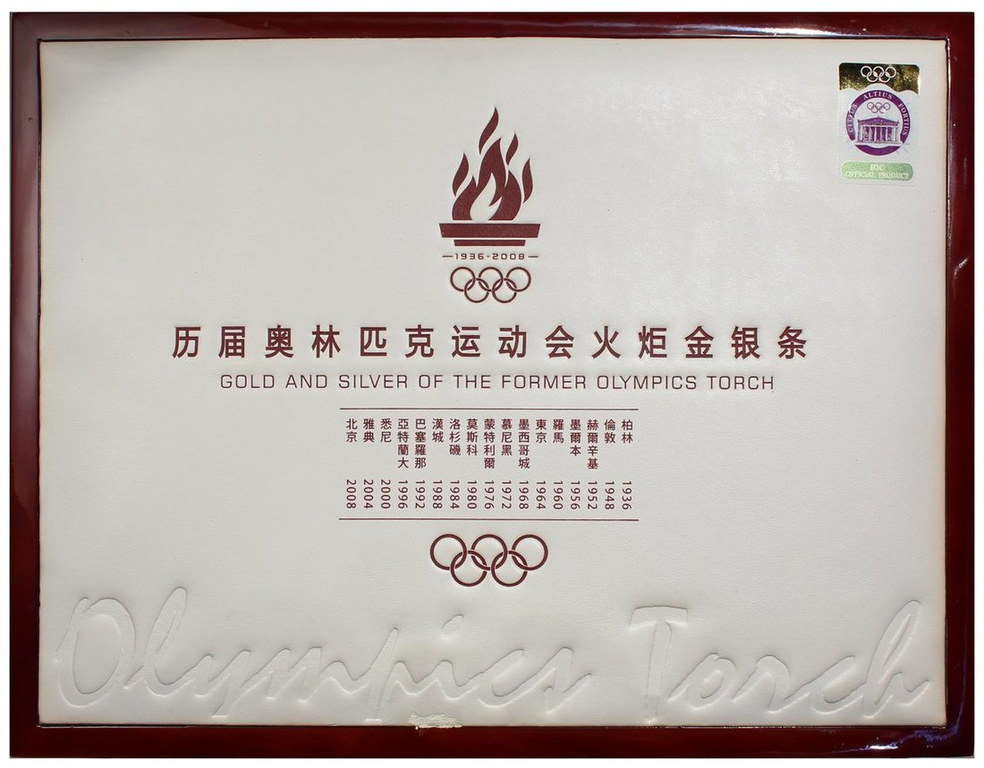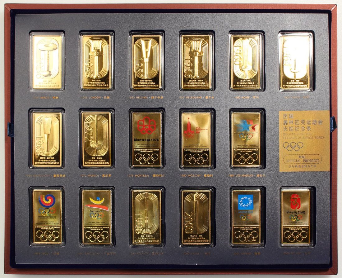 2008年歷屆奧林匹克運動會火炬紀念條共2組,首組包括1枚金條及16枚銀條,各重20克,純度達.999,含金量0.6盎司,含銀量10盎司,第二組包括17枚鍍金章,首組proof FDC,若干有氧化,第二組UNC,連原盒,首組附證書,編號07027,發行10000套