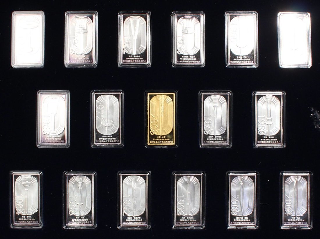 People's Republic of China, 2 sets of Torches of All Previous Olympic Games commemorative medallions, 2008, each medallion bears a depiction of previous Olympic Torches since 1936, one set of 1x gold and 16x silver, each weighs 20g, both gold and silver medallions are of .999 fineness, in total 20g (0.6oz) AGW and 320g (10oz) ASW,
