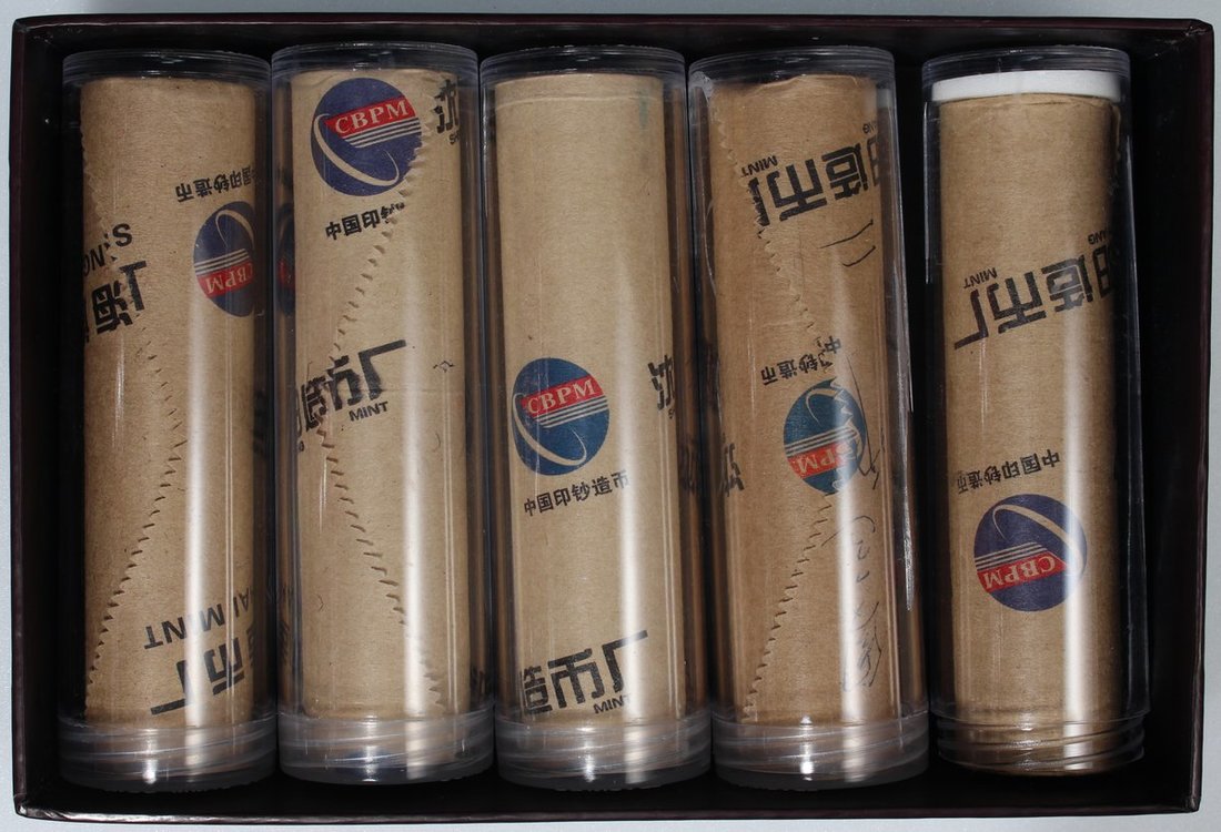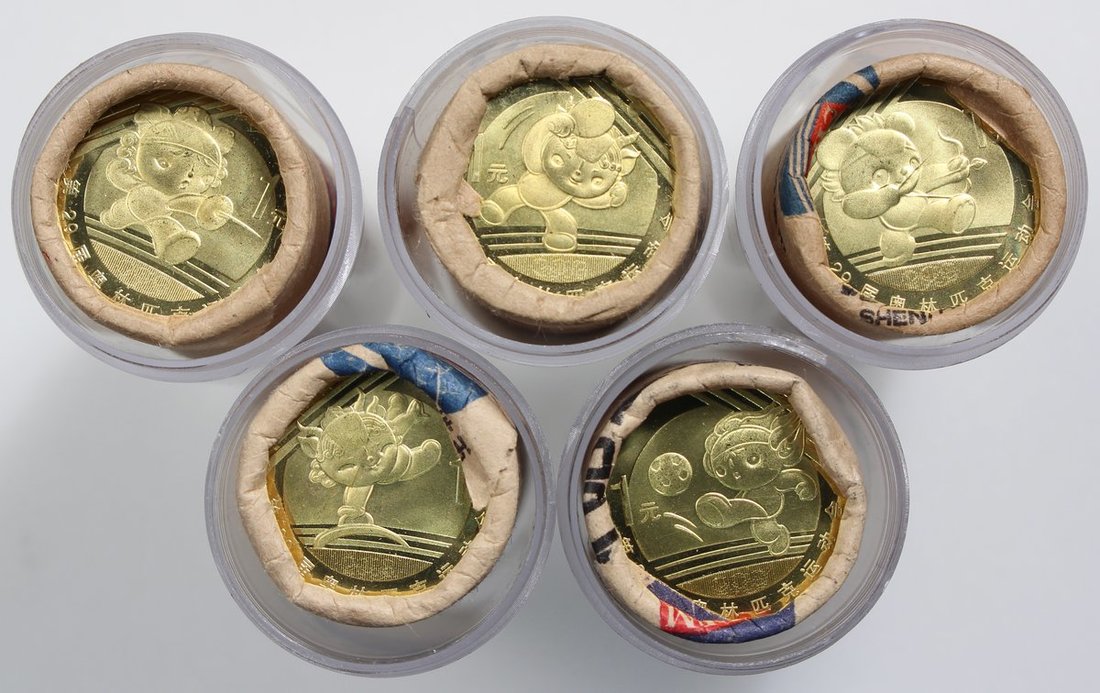 People's Republic of China, 5x tubes of 50x brass 1 Yuan, 2008, commemorative issue for the Beijing Olympics, total of 250 coins, various obverse depictions including Archery, Soccer, Ping-Pong, Gymnastics and Fencing,