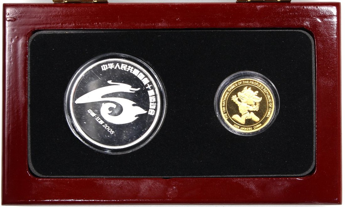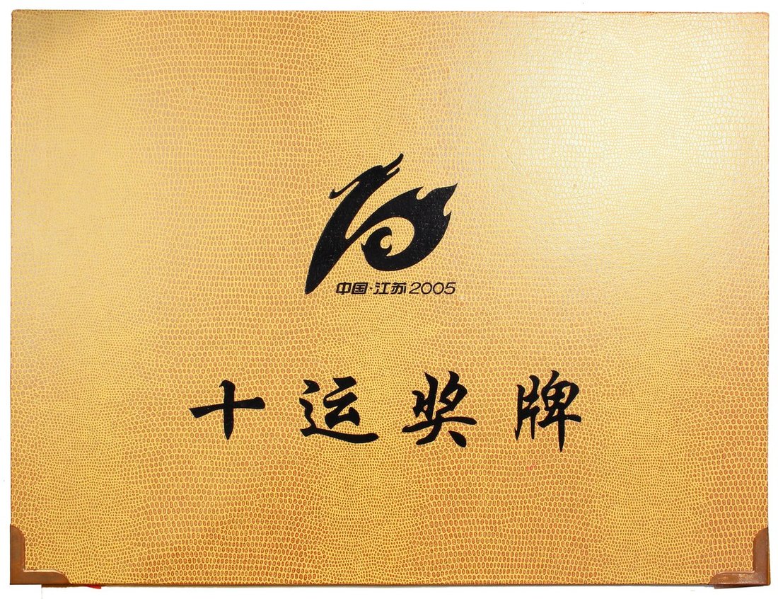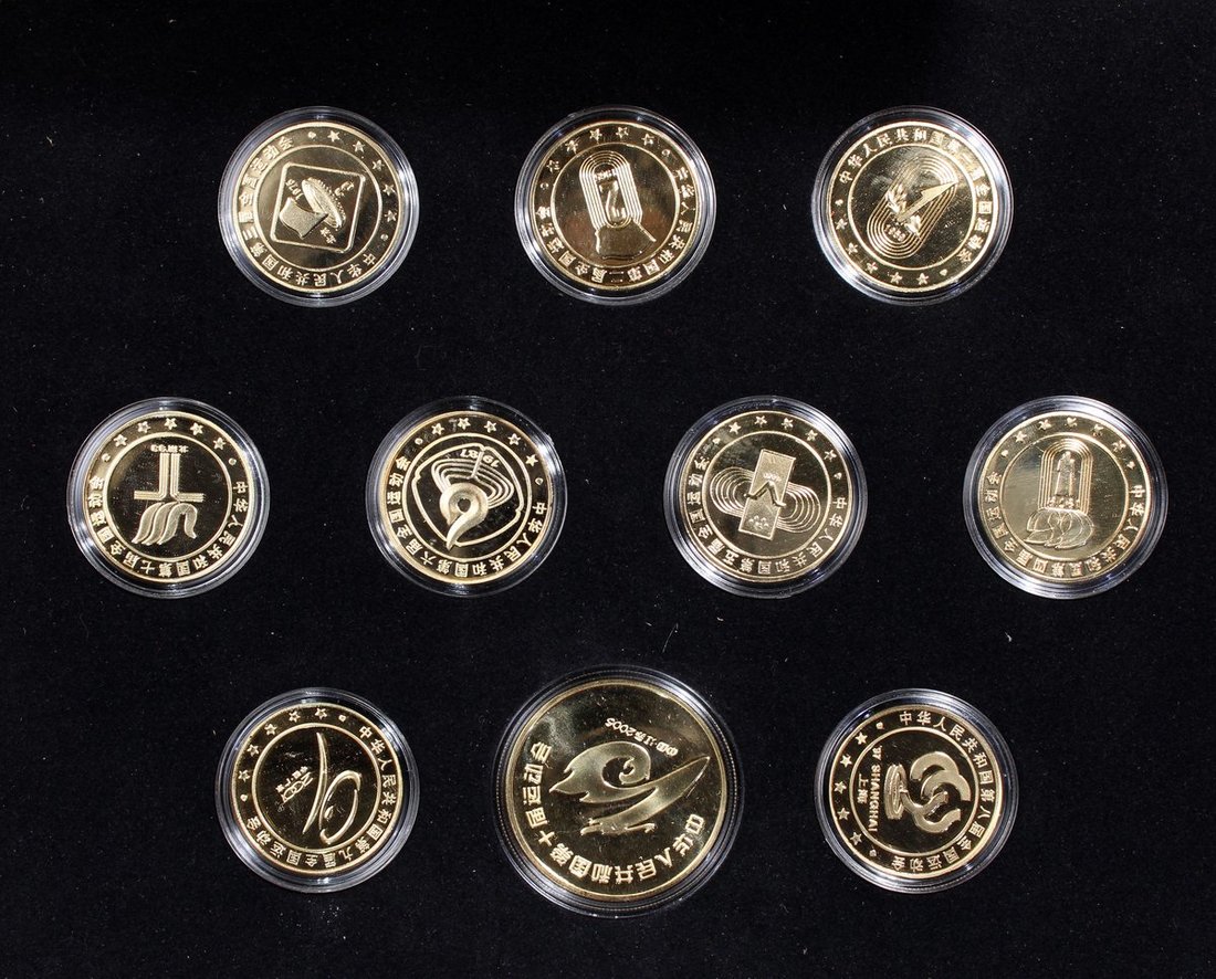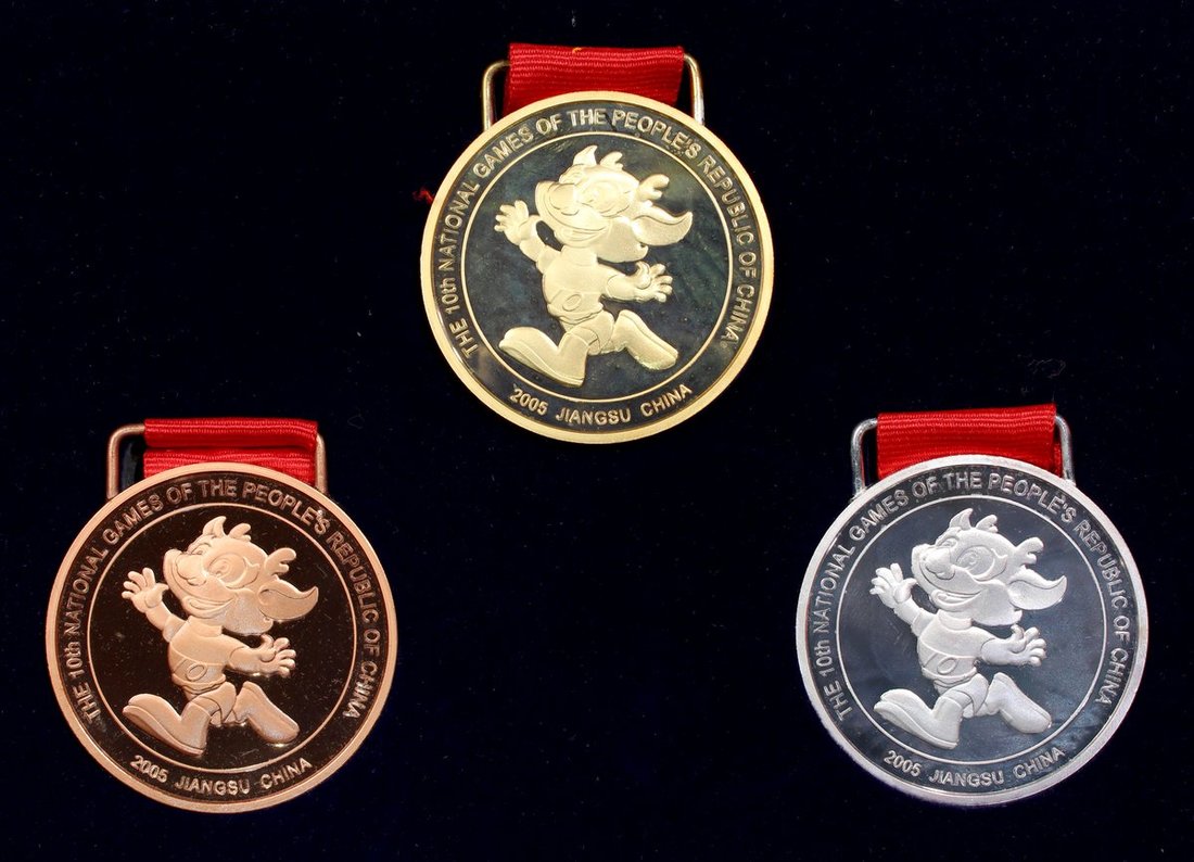 People's Republic of China, 4x commemorative sets for The 10th National Games of the PRC, Jiangsu, 2005, 2 sets each with 10x gold plated medals, 1 set of brass, copper and silver medallions and 1 set of gold and silver medals, weighs 8g and 1oz respectively and are of .999 fineness,