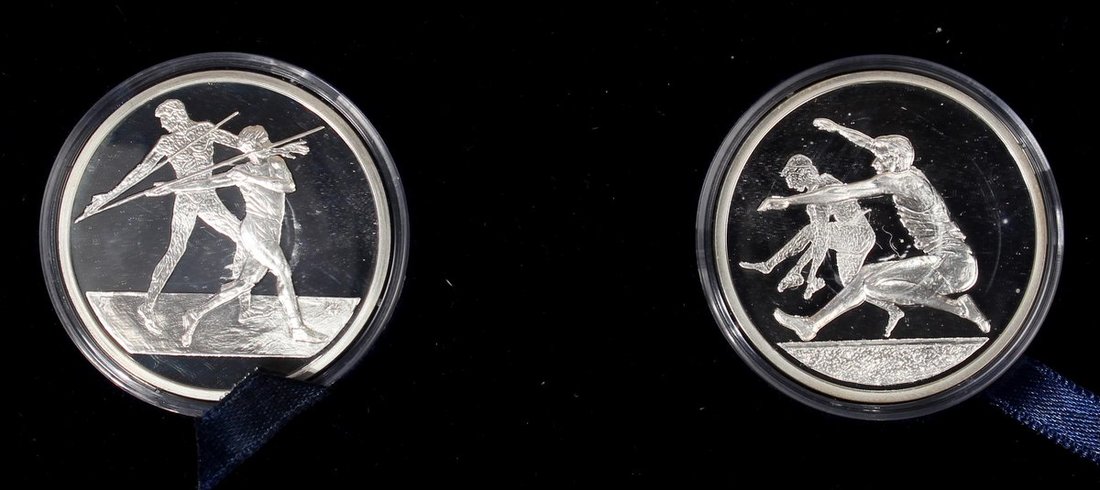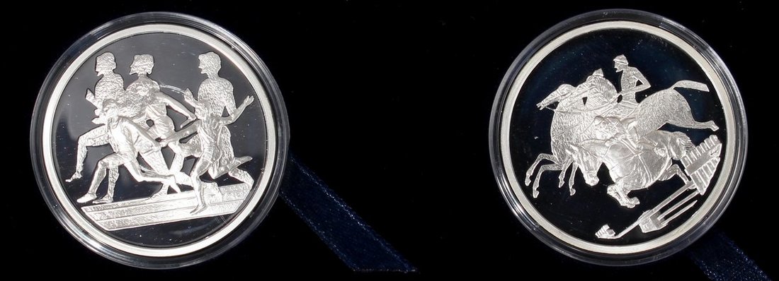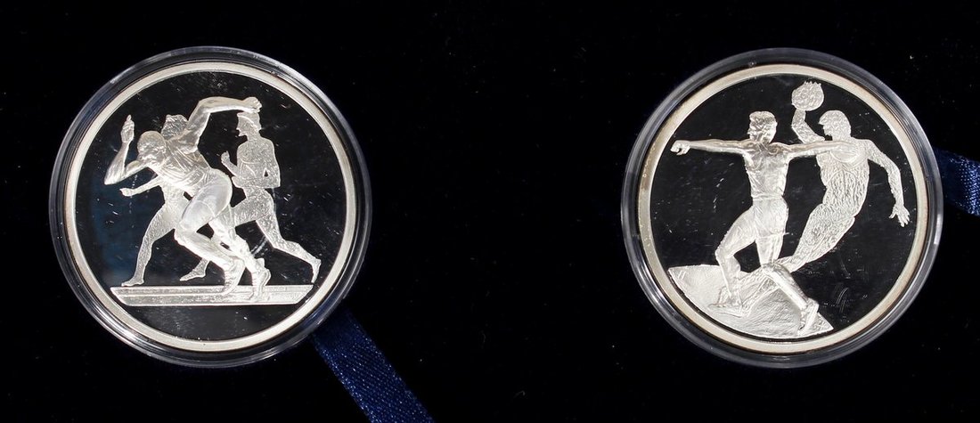 2004年雅典奧林匹克運動會金銀紀念幣共三組,分別為第一、二及三組,共有6枚10歐元精鑄銀幣,各重34克,0.925銀,總含銀量188.7克(6.1盎司),proof FDC,連原包裝及證書,編號100446, 099858 及 272516,每枚最高發行量為80000枚