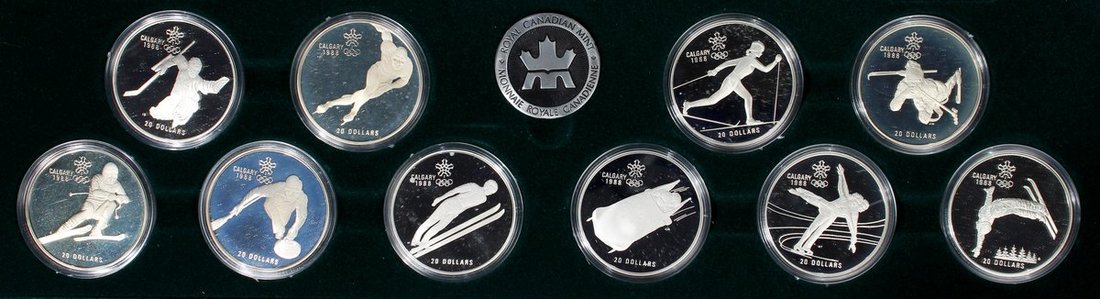 Canada, commemorative proof set of 10x silver $20, 1985-1987, issued for the 1988 Calgary Olympics, each weighs 1oz containing .925 silver, also $1, 1985, 100th anniversary of the National Parks, weighs 1oz containing .500 silver, in total 9.75oz ASW,