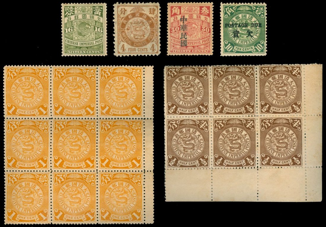 1897-1912年蟠龍新票及其加蓋新票30枚,包括石印蟠龍半分至4分各一枚,倫敦版蟠龍半分2枚,3分,紅4分,玫紅5分,青蓮5分,7分,藍10分,16分各一枚,半分帶右下直角邊六方連1件,1分九方連1件,蟠龍加蓋欠資10分1枚,加蓋宋體中華民國30分1枚,整體品相上佳,請預覽